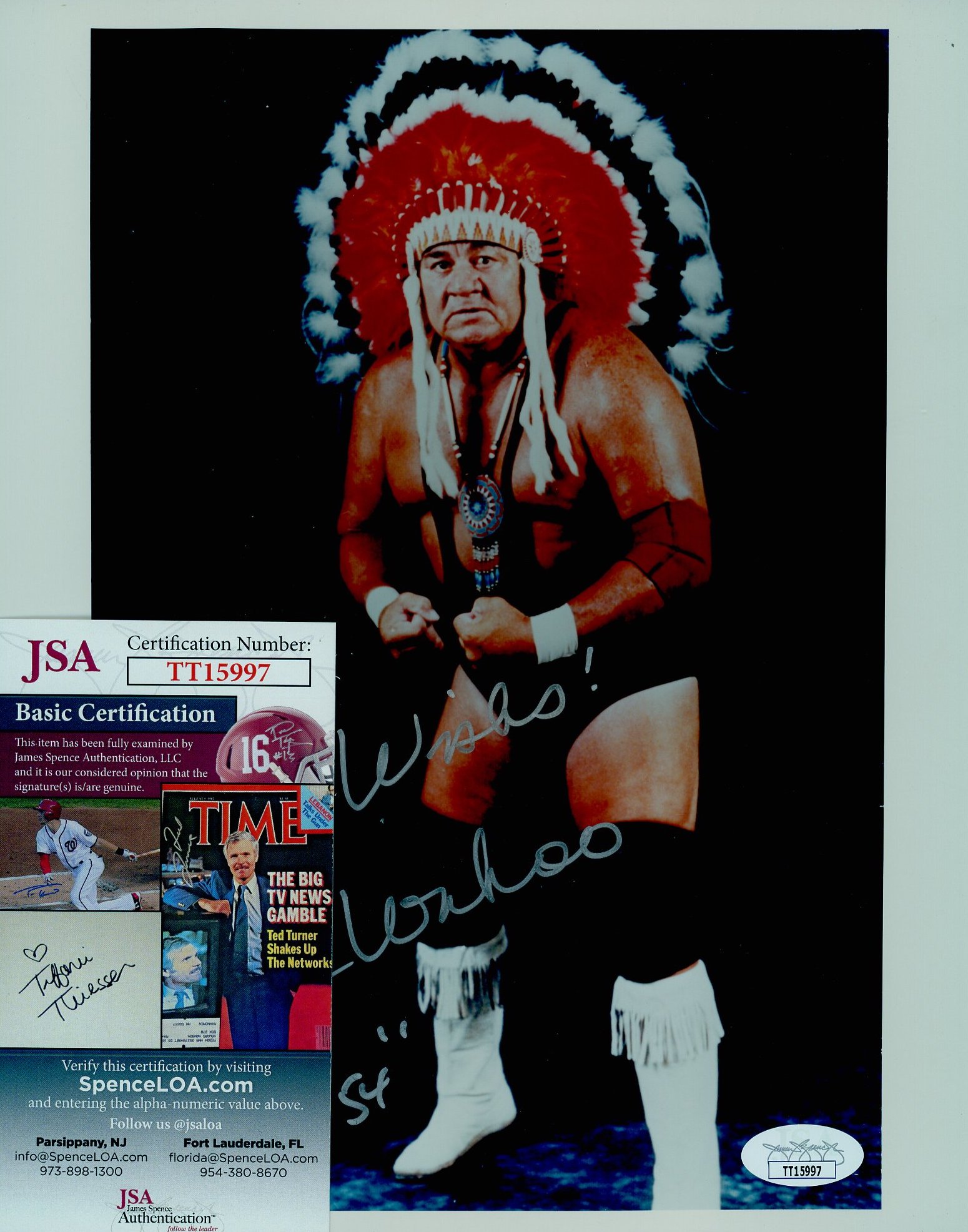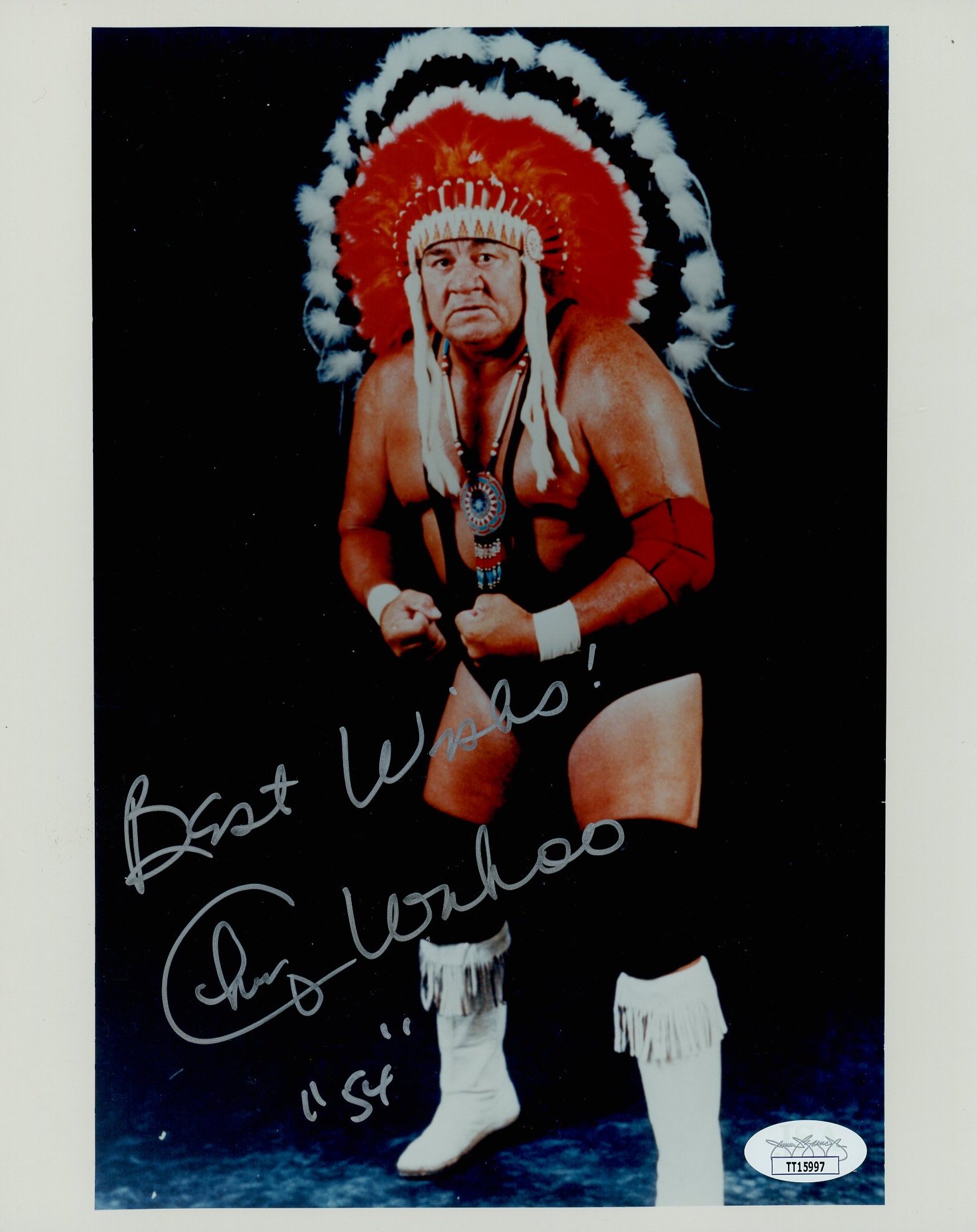 Photo measures 8" x 10" in size and has been hand-signed and inscribed by Chief Wahoo McDaniel (D. 2002).