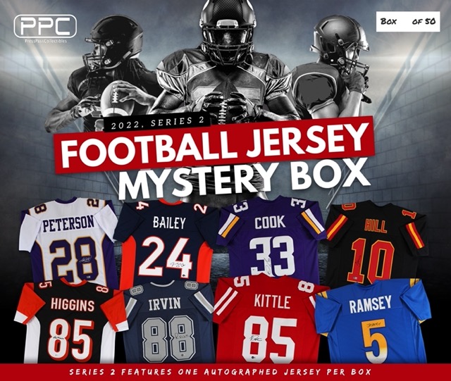 The Press Pass Collectibles 2022 football jersey mystery box includes one (1) custom jersey from your favorite NFL teams. Mega hit boxes will feature jerseys signed by Dalvin Cook, Adrian Peterson, Tyreek Hill, George Kittle, and many more Stars / Hall of Famers!