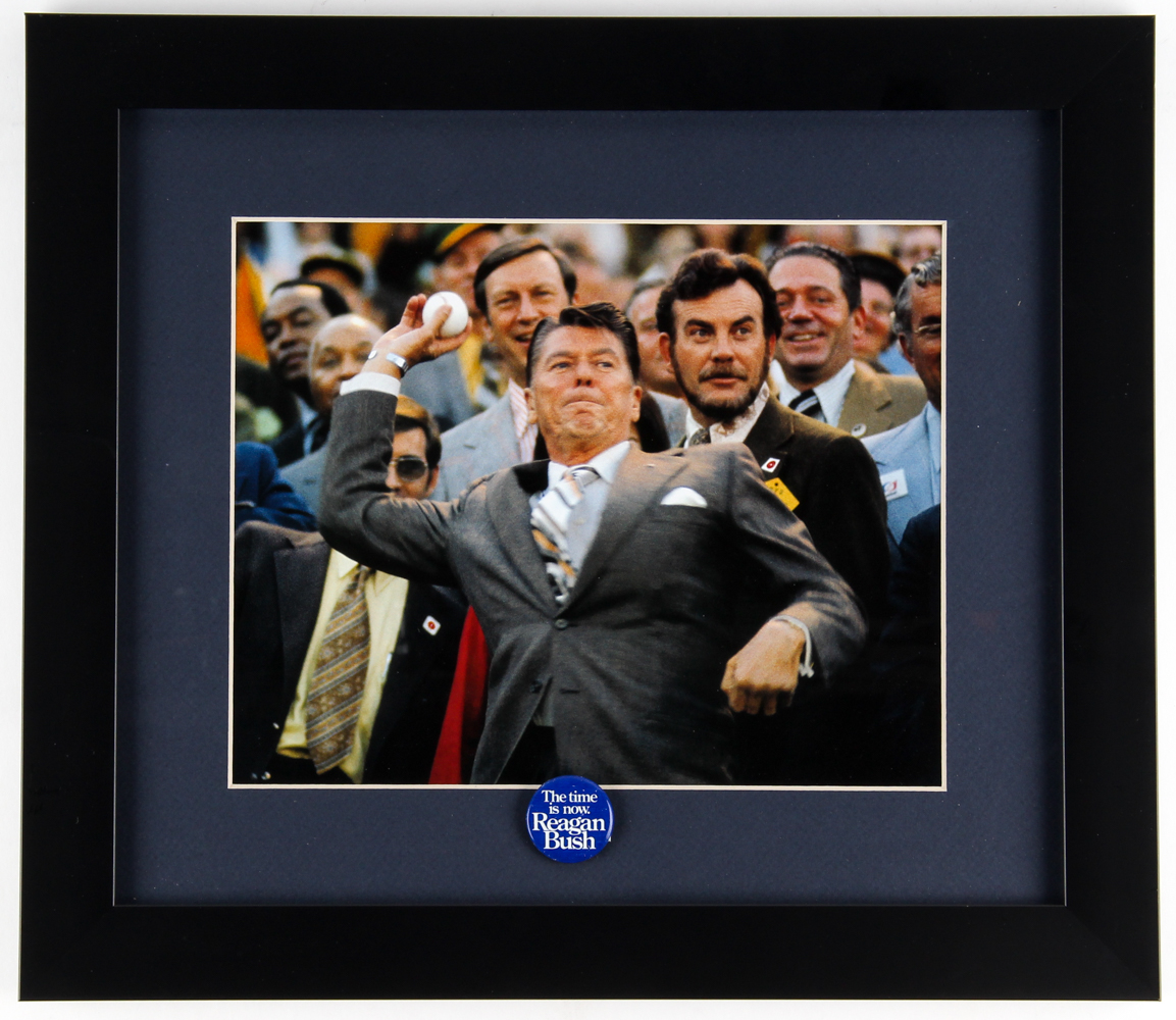 Custom framed display measures 13" x 15" in size and features a photo of Ronald Reagan (D. 2004). The display also includes a Ronald Regan campaign button. Please note, the display is unsigned.