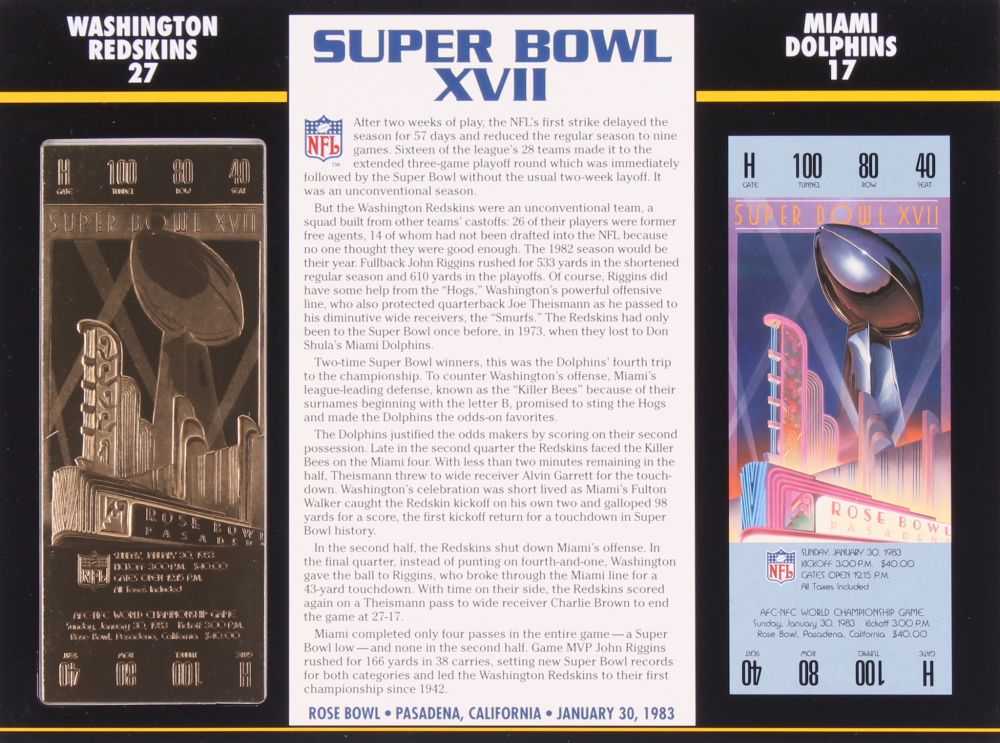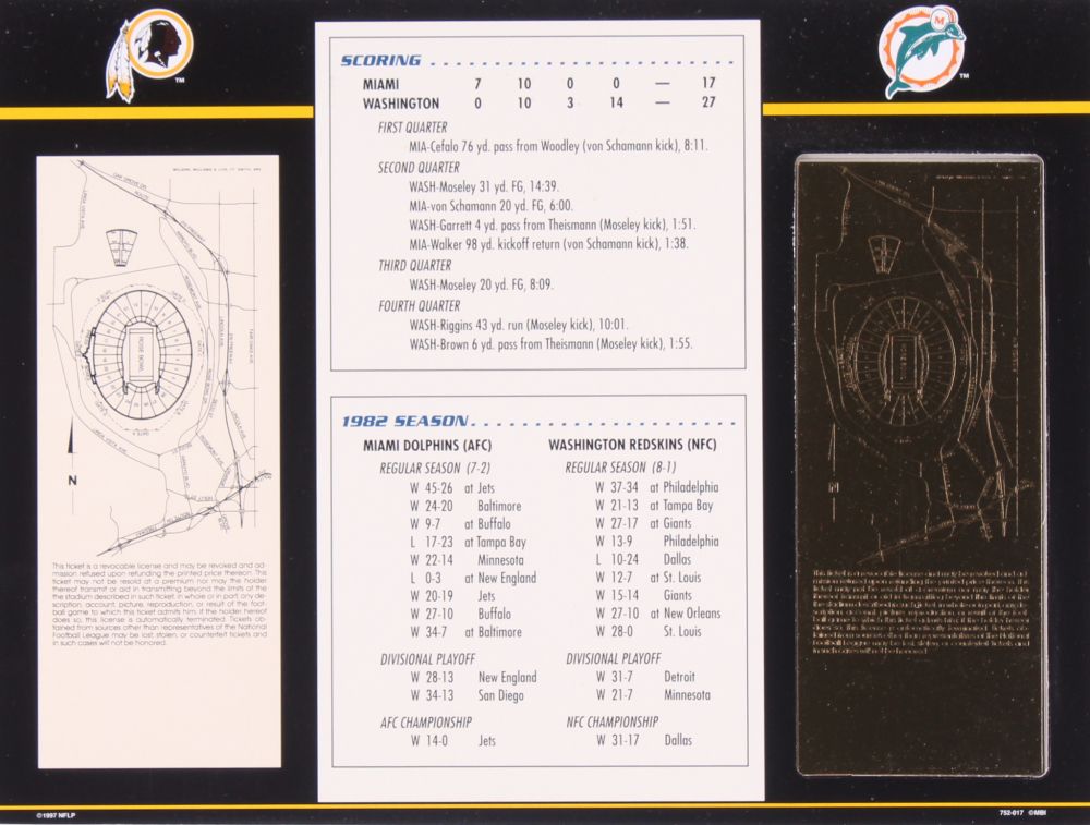 1983 Commemorative Super Bowl XVII Card with Ticket: Commanders vs Dolphins