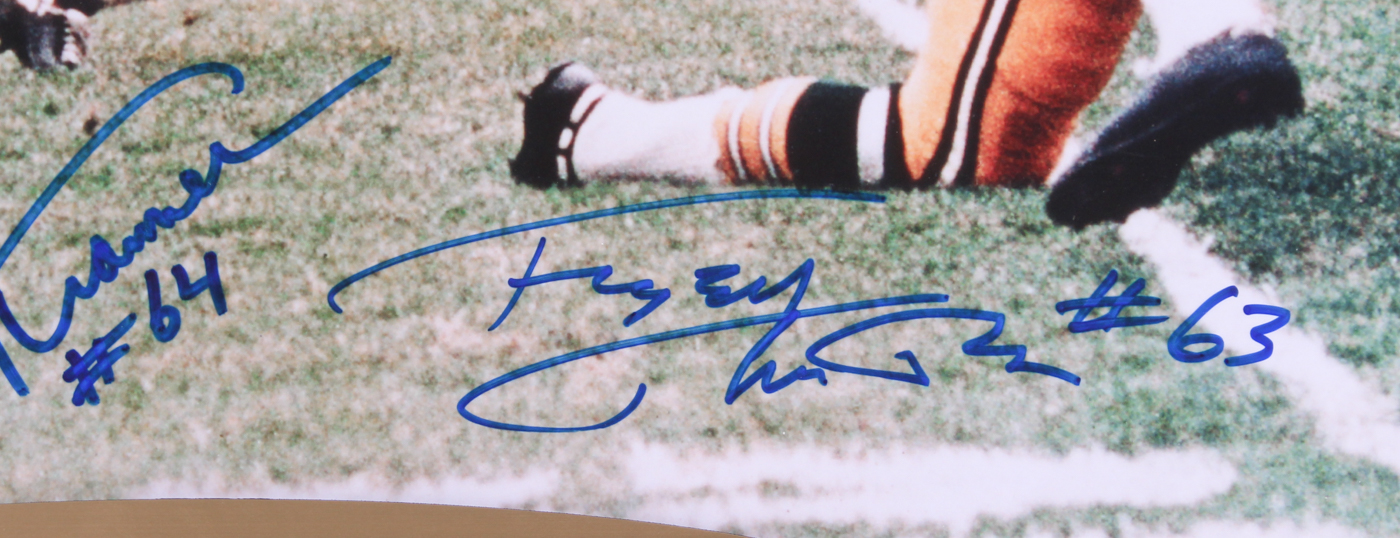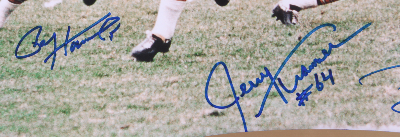 Custom framed display measures 24" x 26" and features a 15" x 20" photo. Photo is hand signed by Paul Hornung, Jerry Kramer and Fuzzy Thurston in blue felt-tip pen. Please note, display is unsigned. See photo for details.