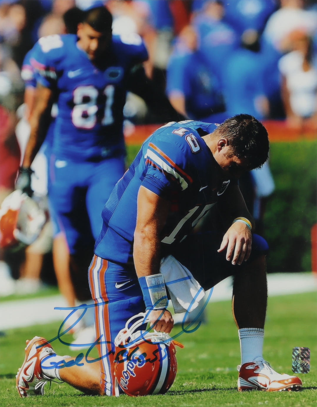 Photo measures 11" x 14" in size and has been hand-signed and inscribed by Tim Tebow (Florida Gators).