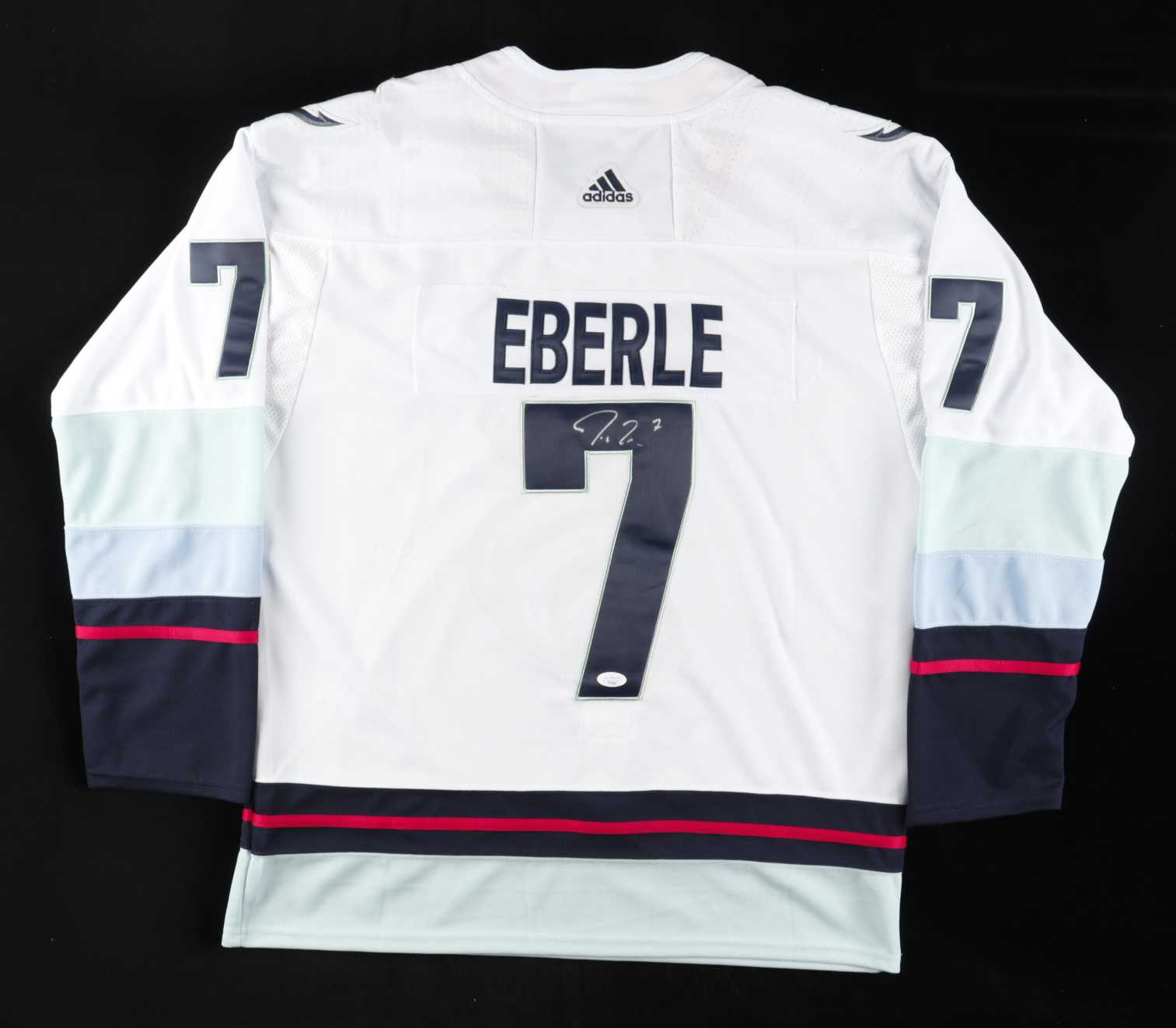 On-ice style jersey. Everything sewn on, size 52. Hand-signed by Jordan Eberle.