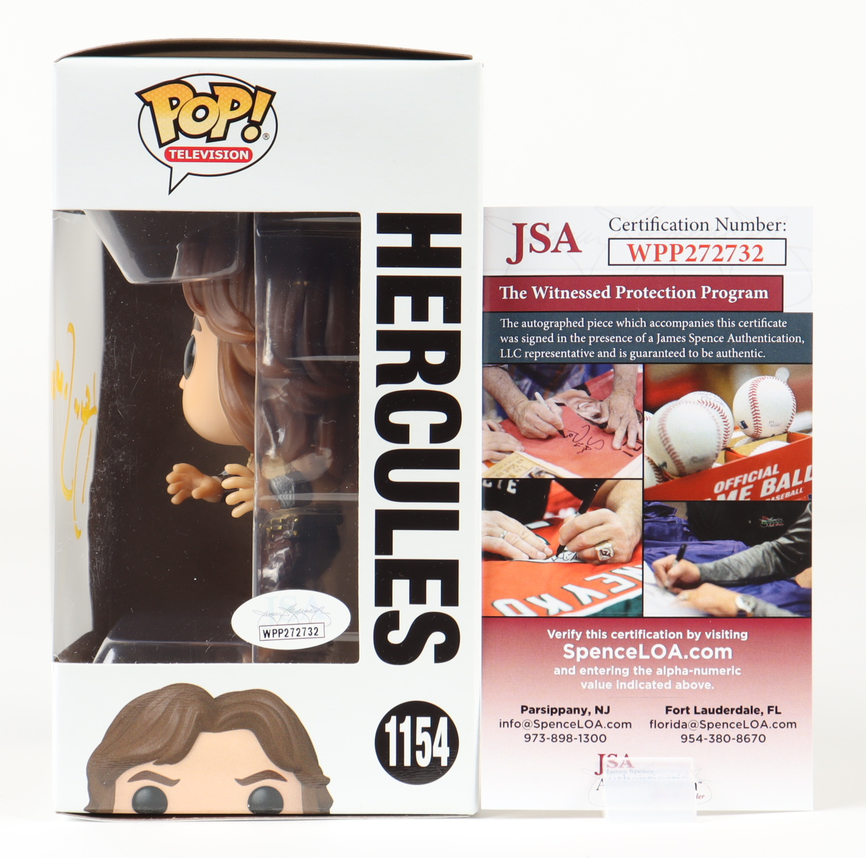 Funko Pop! figure measures approximately 4" tall and has been hand-signed on the packaging by Kevin Sorbo (Hercules).