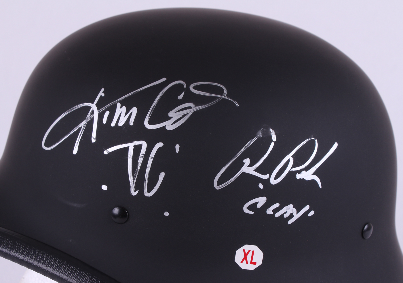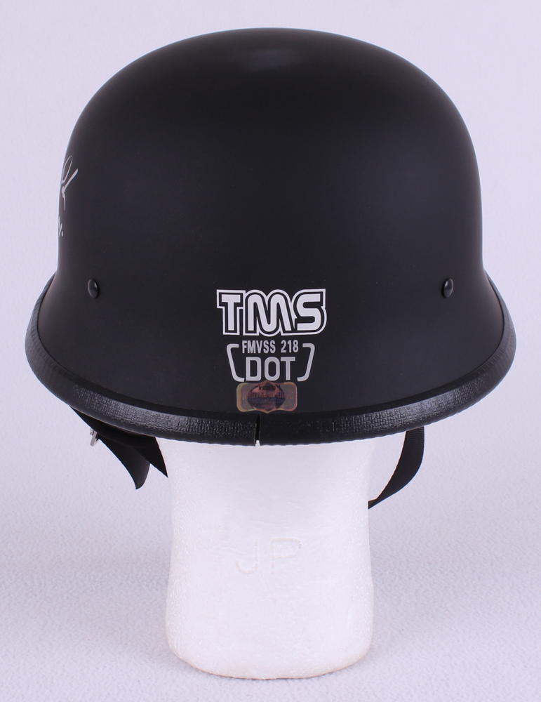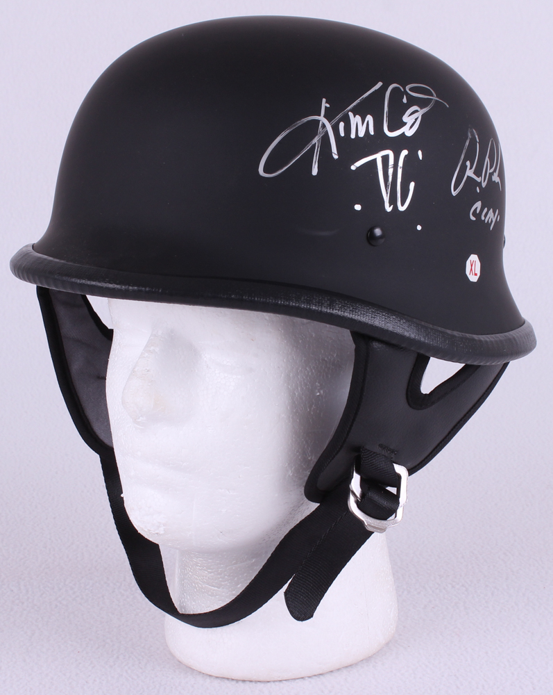 Biker helmet hand-signed and inscribed in silver paint pen by Ron Perlman (Clarence 'Clay' Morrow) and Kim Coates (Alex 'Tig' Trager). Please note, the helmet does not come with display stand.