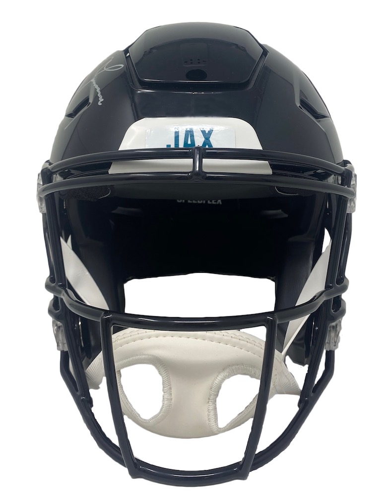 Riddell Jacksonville Jaguars full-size authentic on field SpeedFlex helmet. Hand-signed and inscribed by Trevor Lawrence. The helmet is a limited edition and has been hand-numbered #/16. You will receive a random number from the edition.