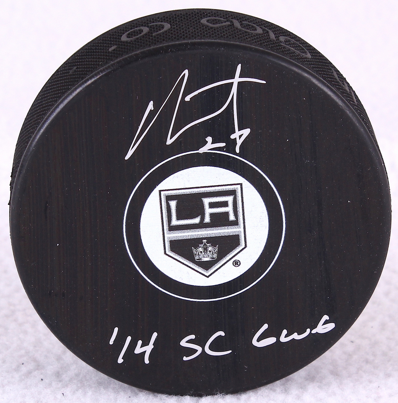 Los Angeles King logo hockey puck hand-signed and inscribed by Alec Martinez.