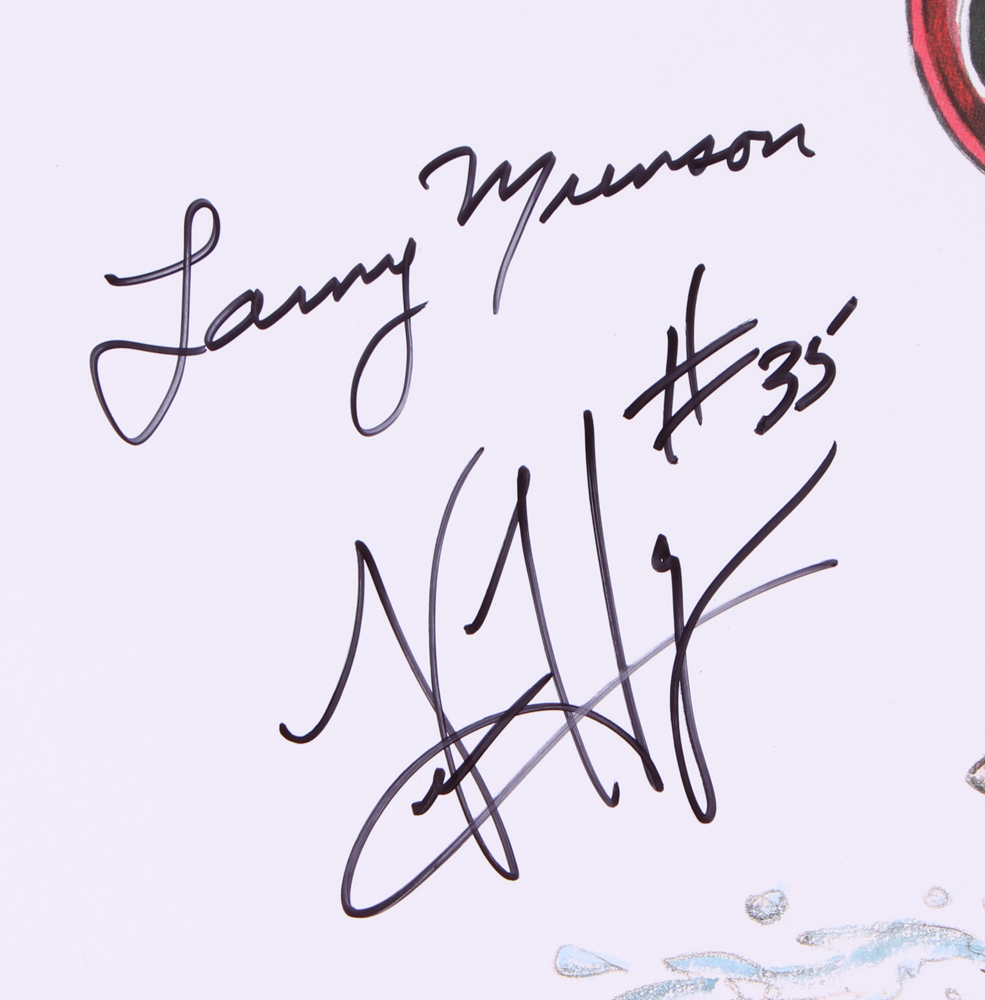 Limited Edition Lithograph measures 18" x 24" and has been hand-signed in black felt-tip pen by Larry Munson (D 2011) and Verron Haynes (Steelers). Also hand-signed in black felt-tip by artist Cal Warlick. Hand numbered #232/1000.