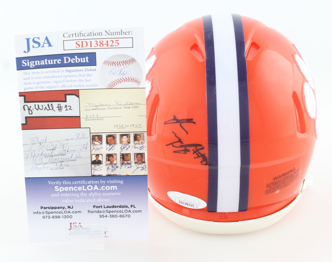 The autograph(s) includes an official James Spence Authentication (JSA) "Signature Debut" hologram and COA. "Signature Debut" is the autographed memorabilia equivalent to a rookie card. The JSA definition of a "Signature Debut" is as follows: "Any item that is autographed and received by JSA prior to the last game of the signer's official rookie season.