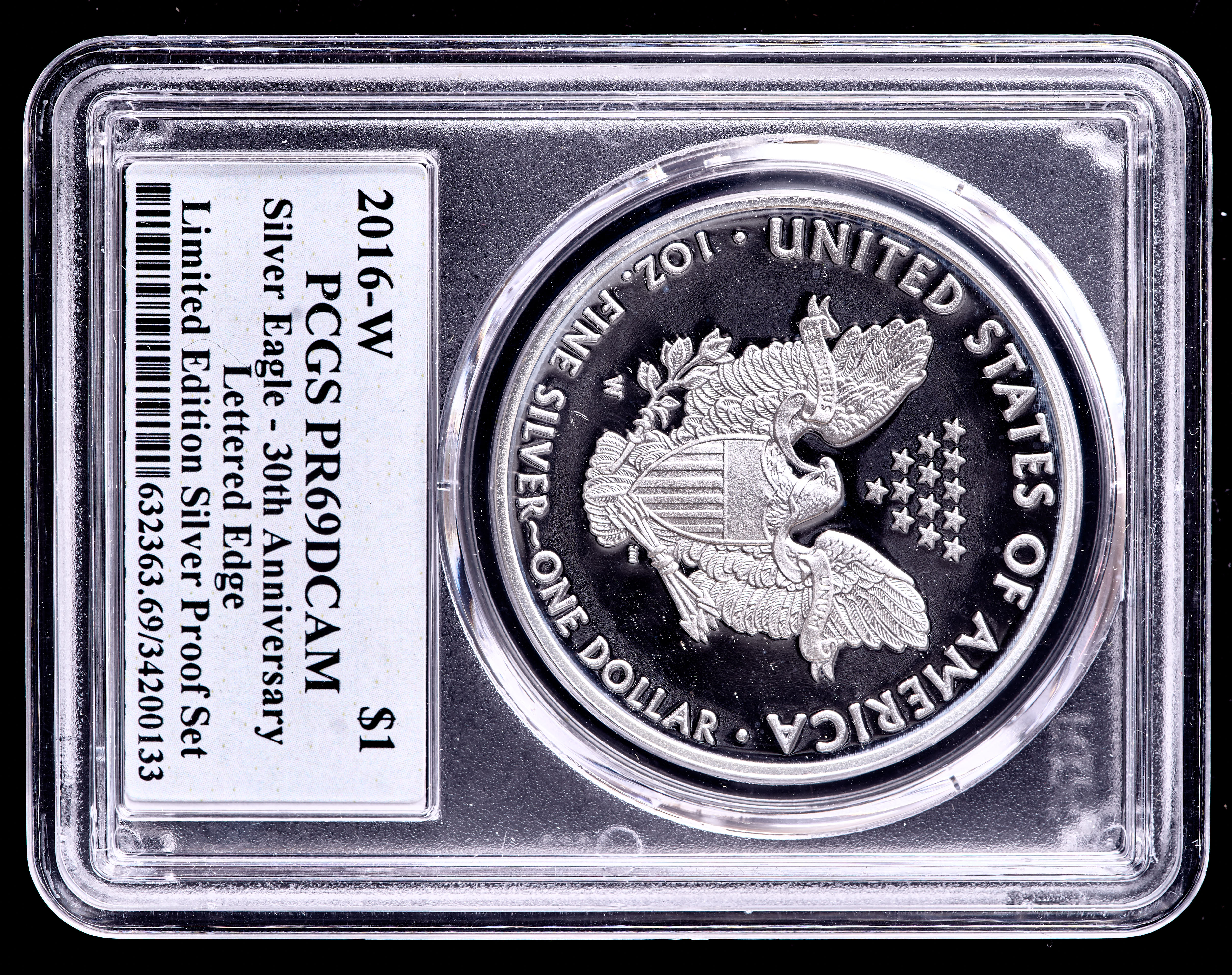 2016-W American Silver Eagle $1 One Dollar Coin - 30th Anniversary, Lettered Edge, From the Limited Edition Silver Proof Set (PCGS PR69 Deep Cameo)