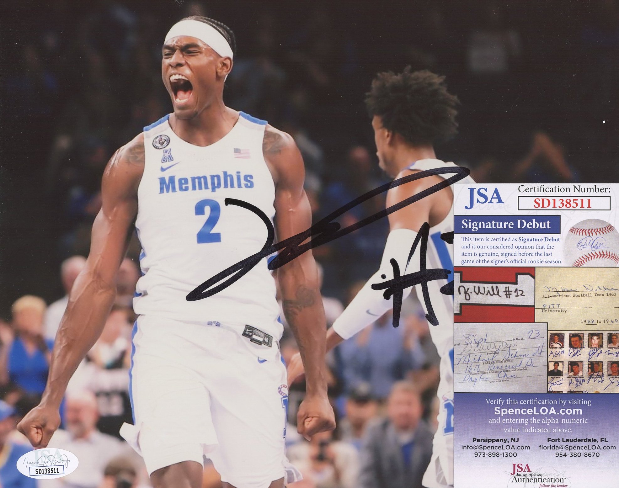 The autograph(s) includes an official James Spence Authentication (JSA) "Signature Debut" hologram and COA. "Signature Debut" is the autographed memorabilia equivalent to a rookie card. The JSA definition of a "Signature Debut" is as follows: "Any item that is autographed and received by JSA prior to the last game of the signer's official rookie season.