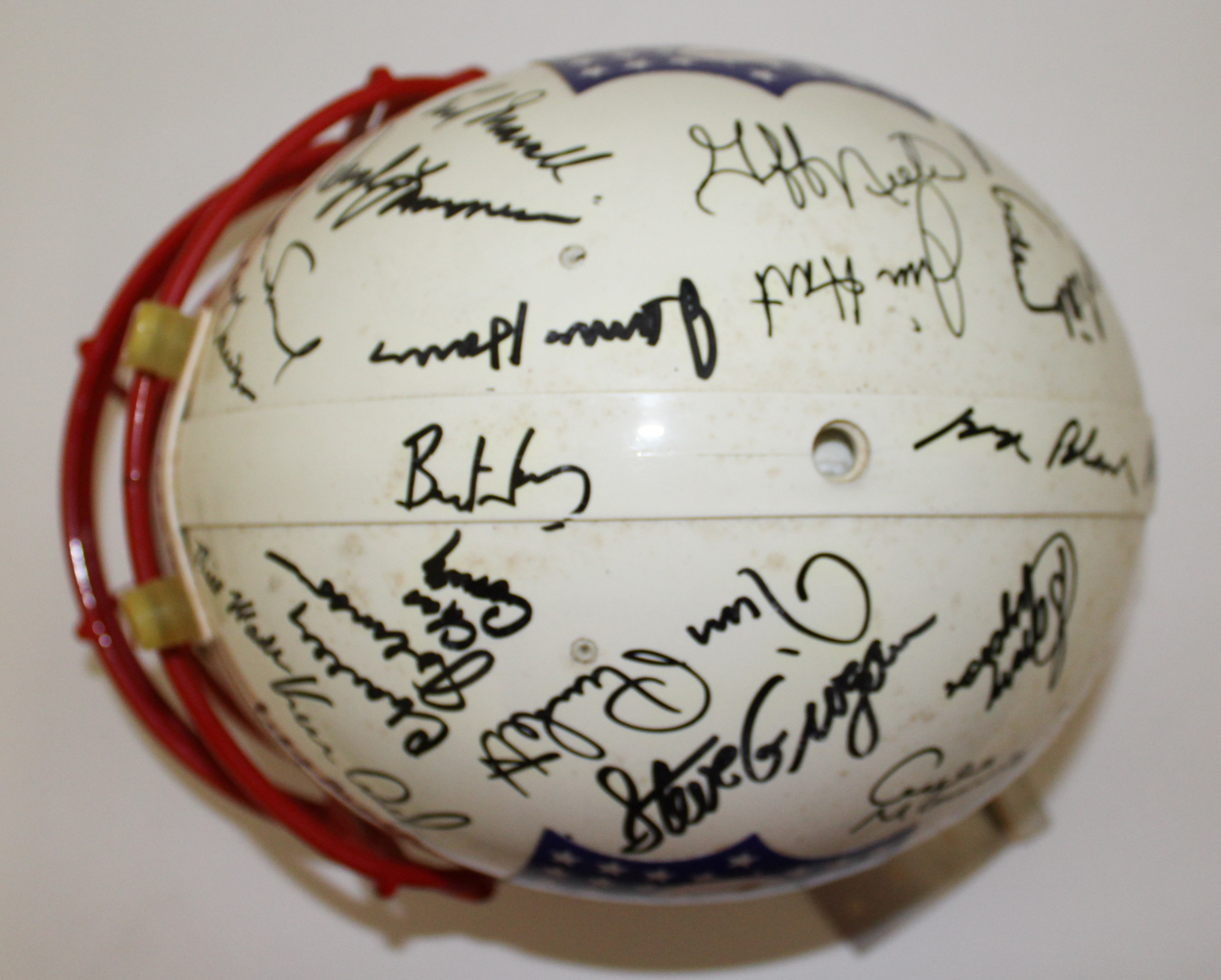 Full-size QB Legends white panel football hand-signed by (32) including Johnny Unitas, Otto Graham, Archie Manning, Doug Williams, Daryle Lamonica, Bert Jones, Craig Morton, Len Dawson, Jim Plunkett, Jim Hart, Roman Gabriel, George Blanda, Ken Stabler, Roman Gabriel, Y.A. Tittle, Joe Theismann and more.