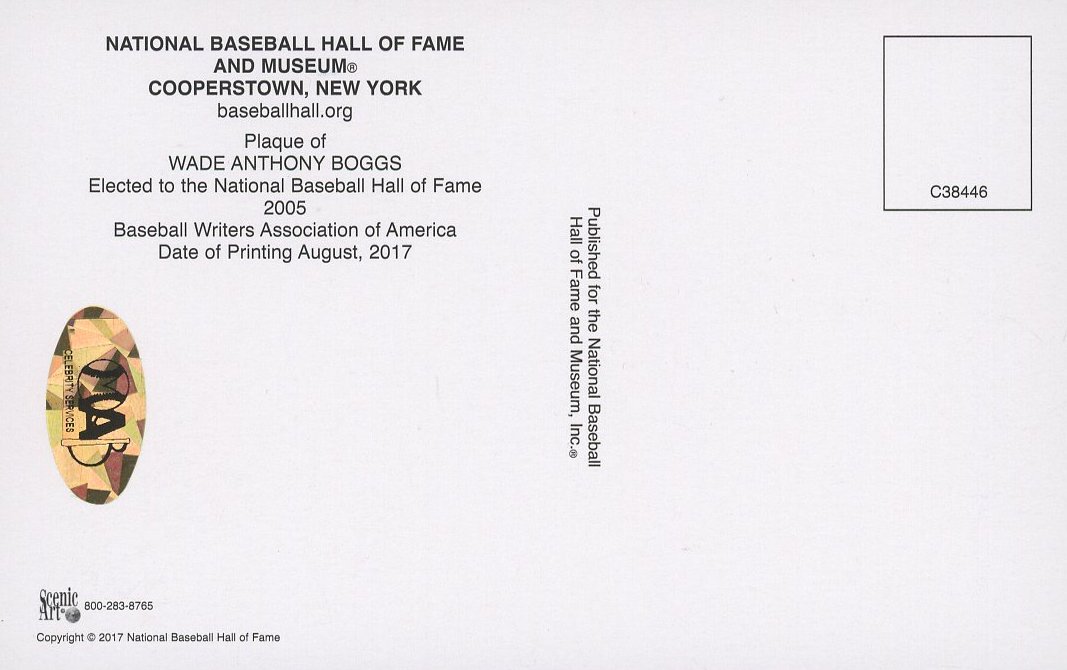 National Baseball Hall of Fame postcard measures 3.5" x 5.5" in size and has been hand-signed by Wade Boggs (Boston Red Sox, HOF).