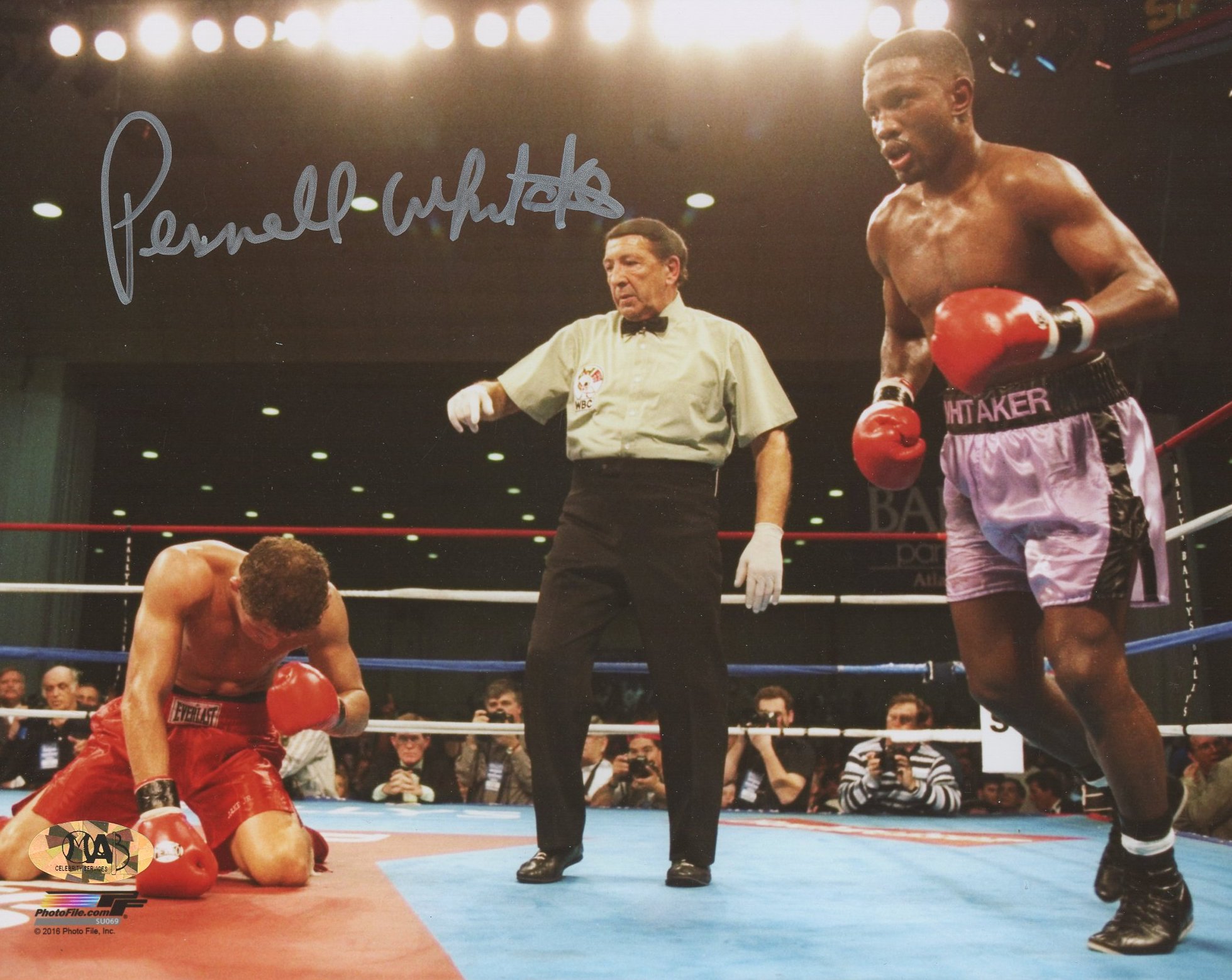 Photo measures 8" x 10" in size and has been hand-signed by Pernel Whittaker (D. 2019, HOF).