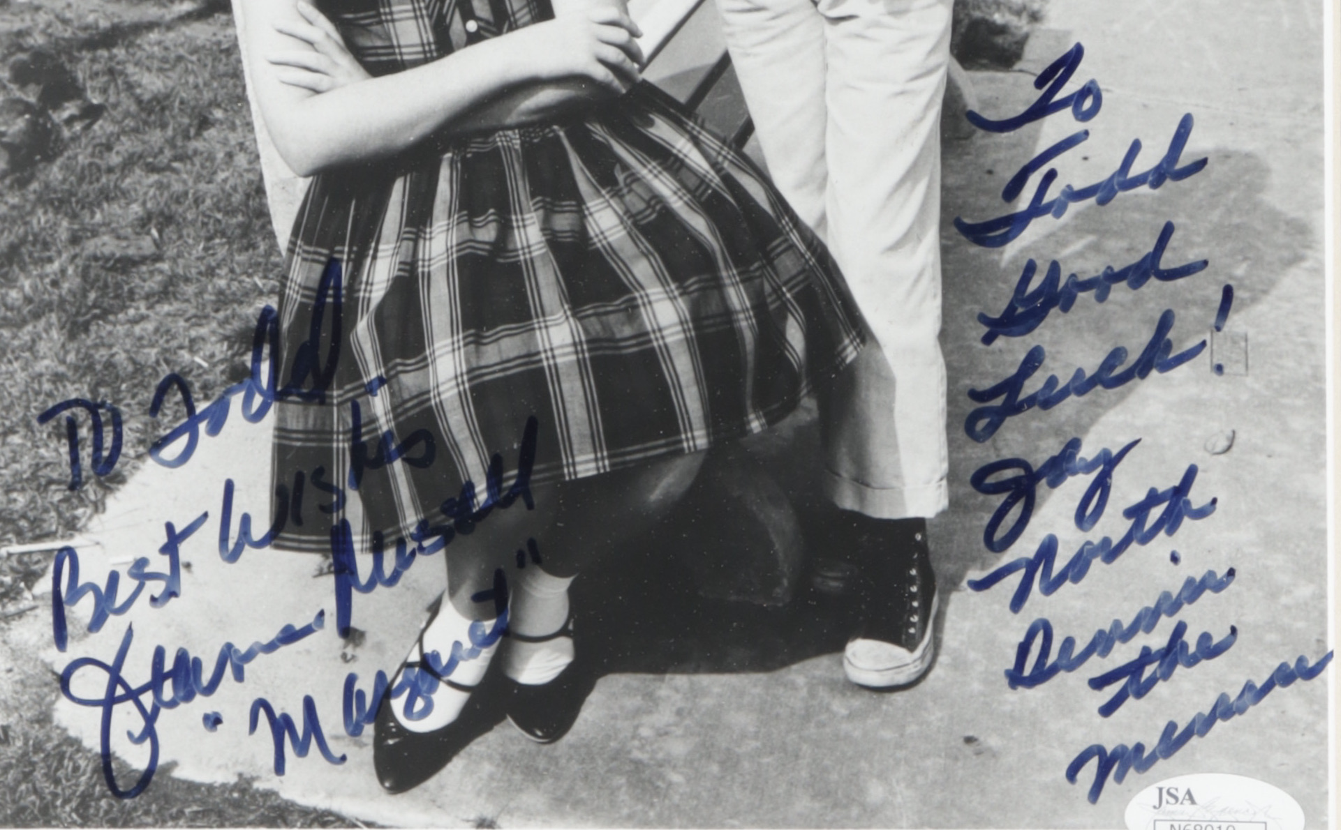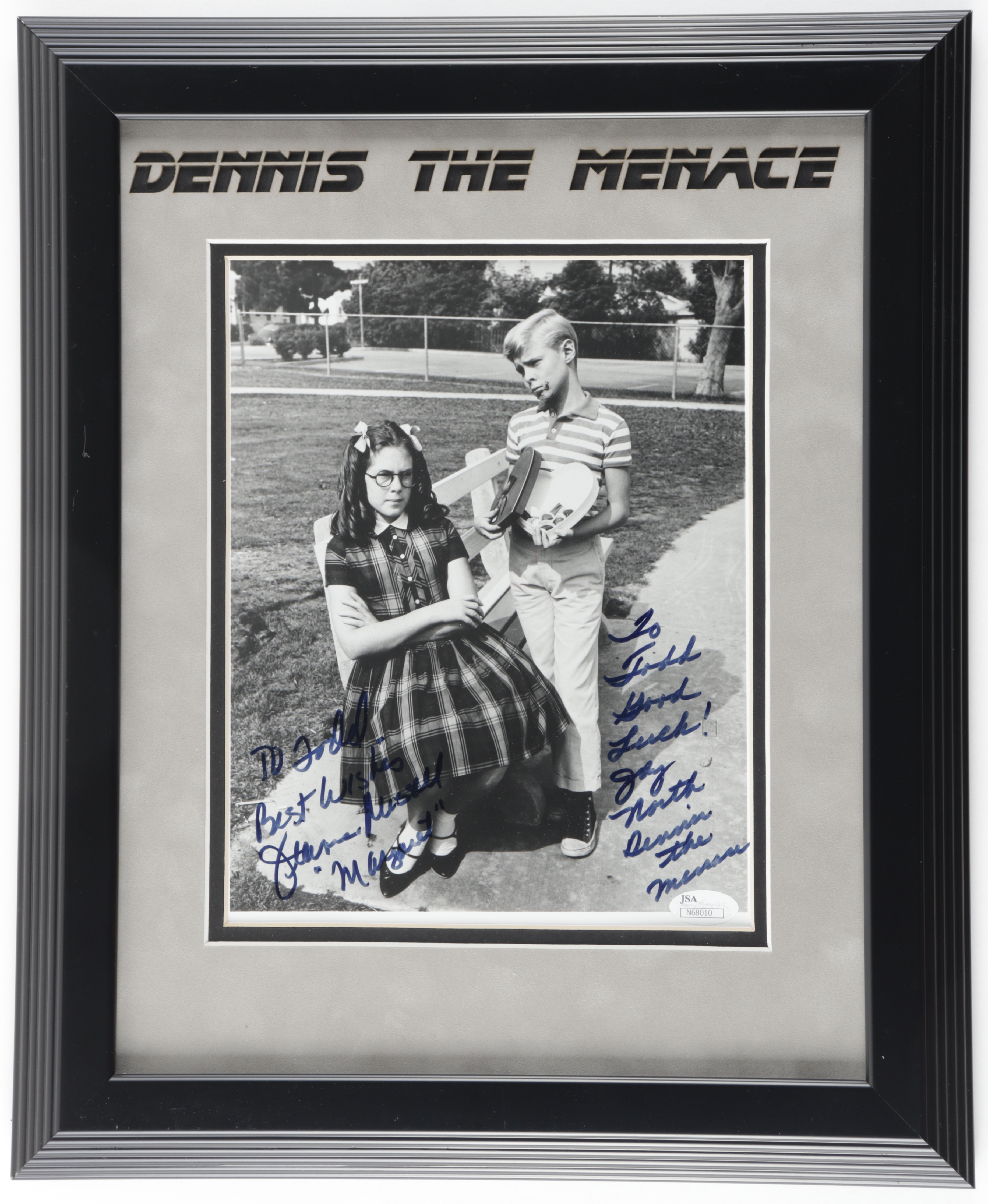Custom frame measures 13" x 16" in size and features a photo hand-signed and inscribed by Jay North (Dennis Mitchell) and Jeannie Russell (Margaret Wade). Please note, the autographs have been personalized "To Todd."