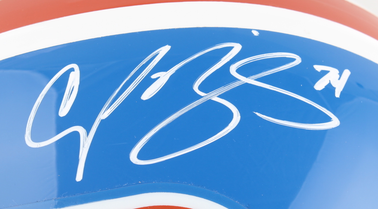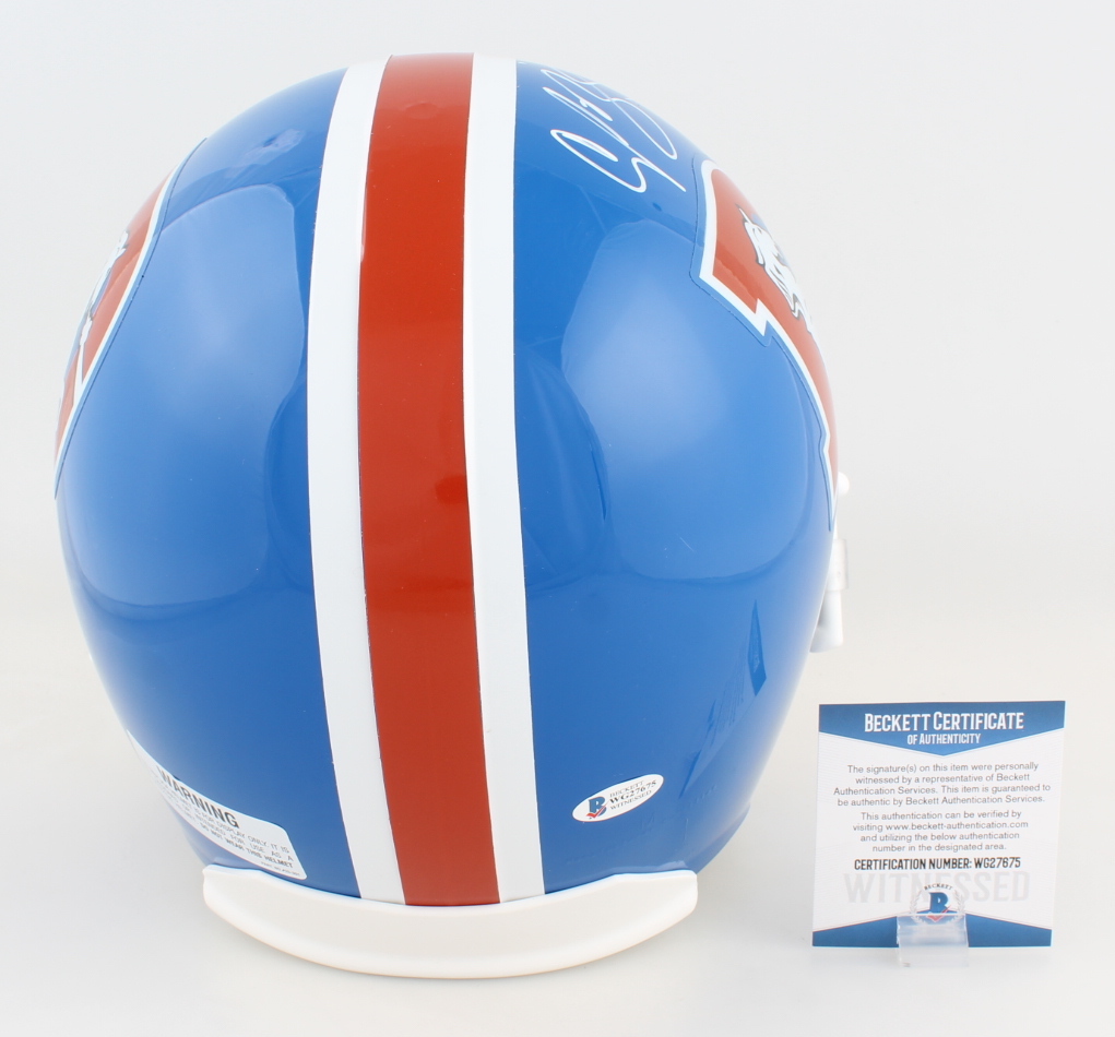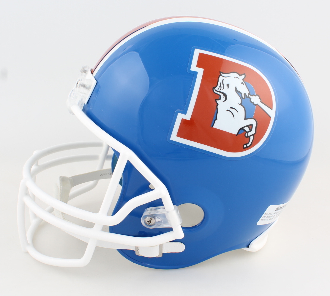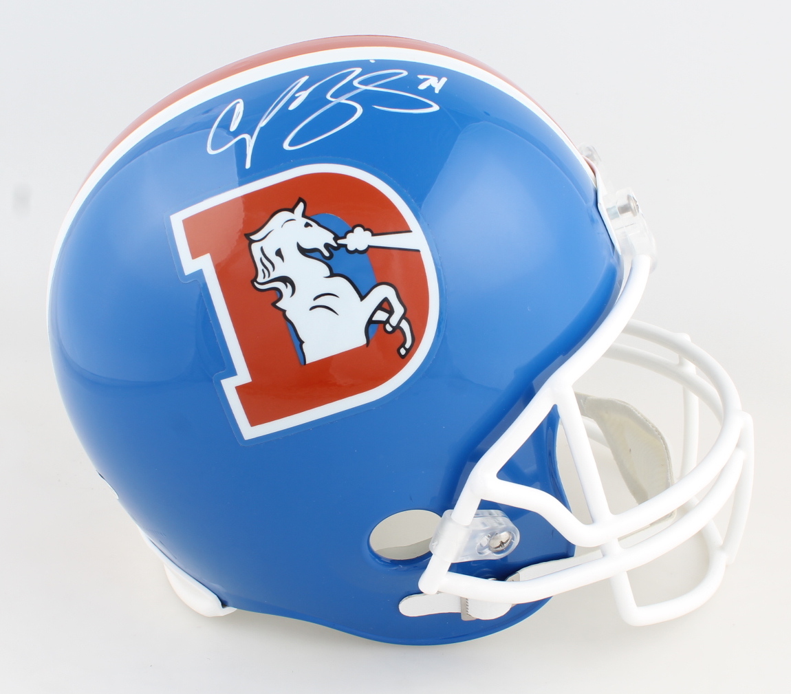 Riddell Denver Broncos full-size replica throwback helmet. Has been hand-signed by Champ Bailey (HOF).