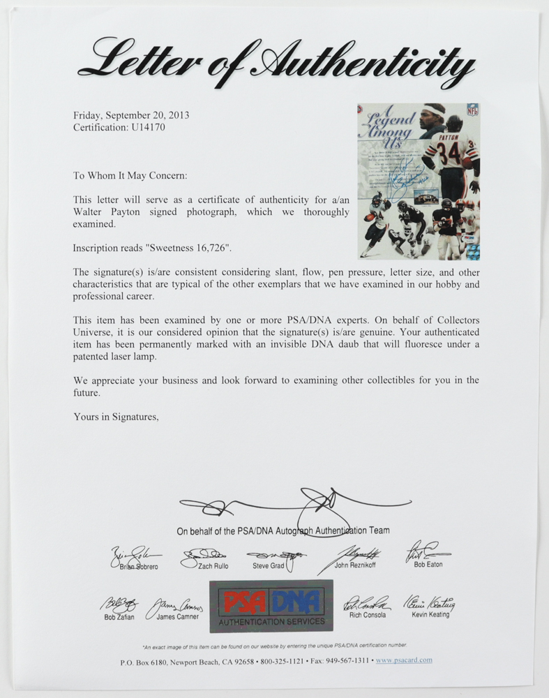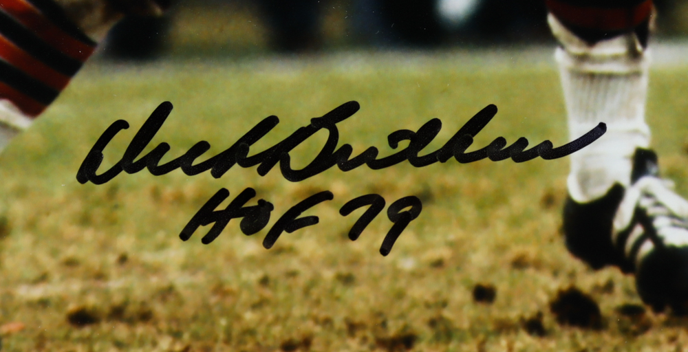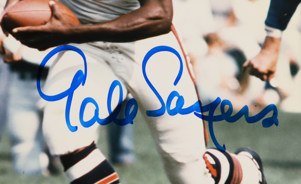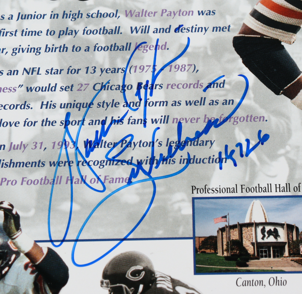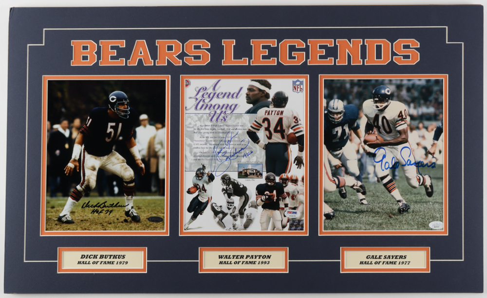 Custom matte measures 18" x 30" in size. Features (3) photos hand-signed and inscribed by Dick Butkus (HOF), Walter Payton (D. 1999, HOF), and Gale Sayers (HOF). (Chicago Bears)