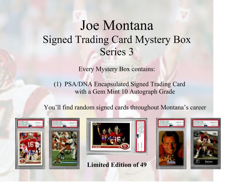 Every Mystery Box contains (1) PSA/DNA Encapsulated Signed Joe Montana Trading Card - NO DUPLICATES