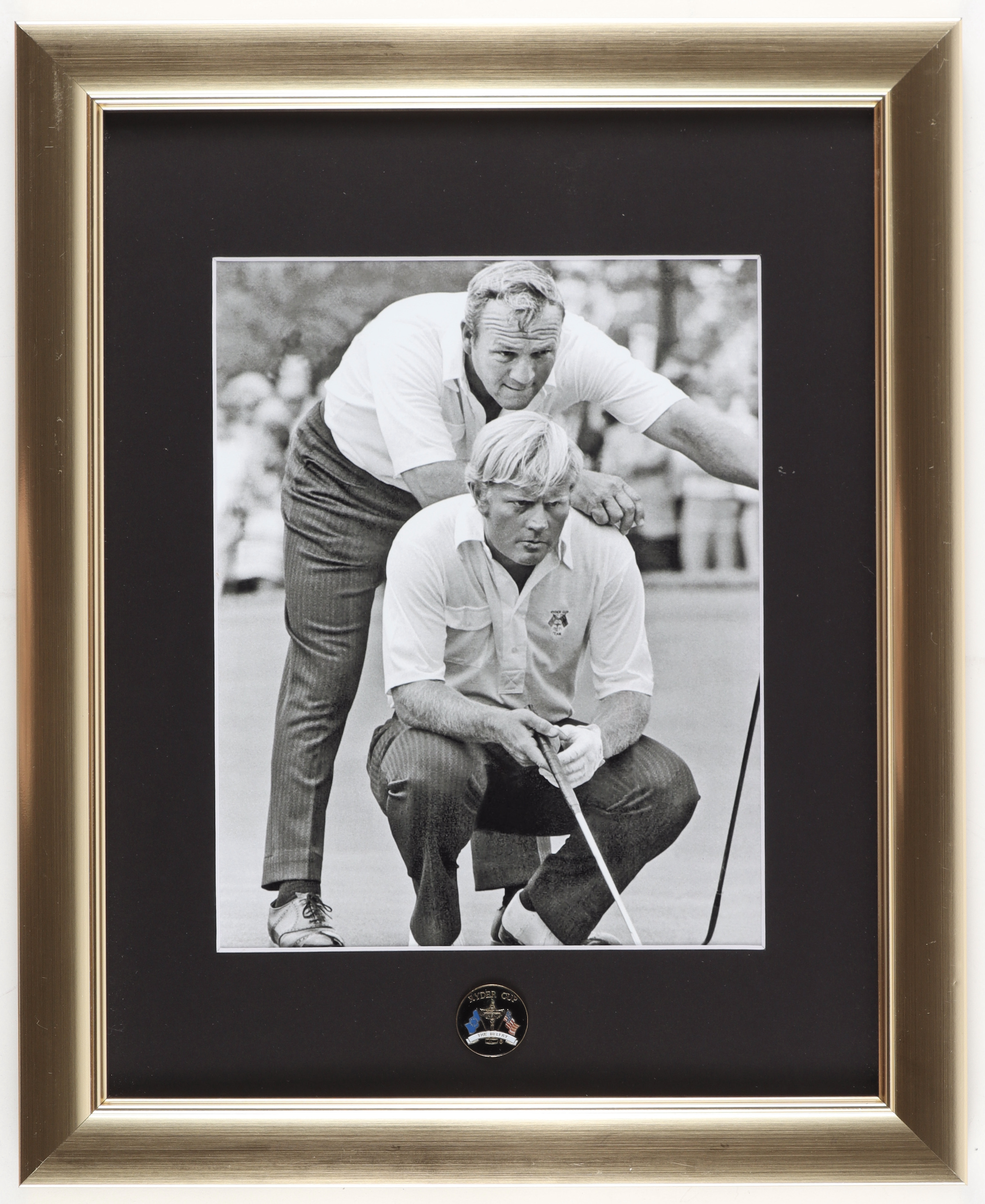 Custom frame measures 13" x 16" in size and features a photo of Arnold Palmer (D. 2016, HOF) and Jack Nicklaus (HOF). Includes a vintage Ryder Cup at the Belfry Pin. Please note, the frame is unsigned, and see the photos for more details regarding the condition of the frame.