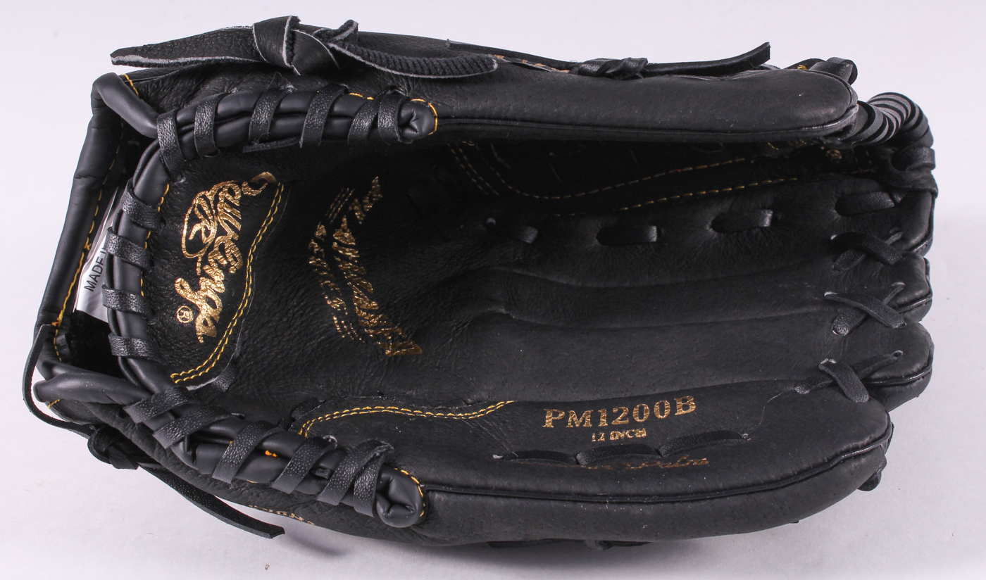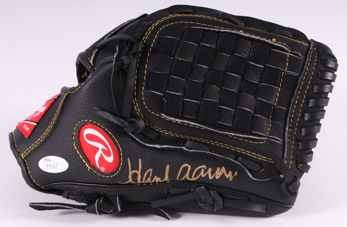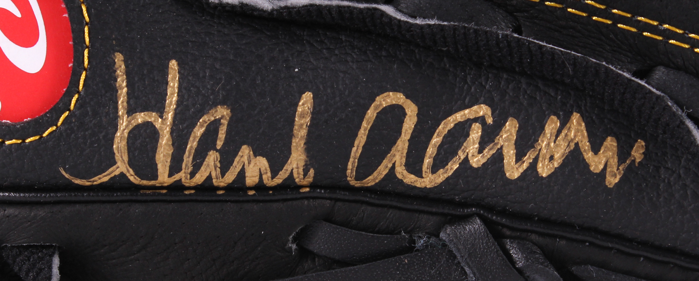 Rawlings Gold Glove Co. full-size baseball glove has been hand-signed in gold paint pen by Hank Aaron (Braves, HOF).