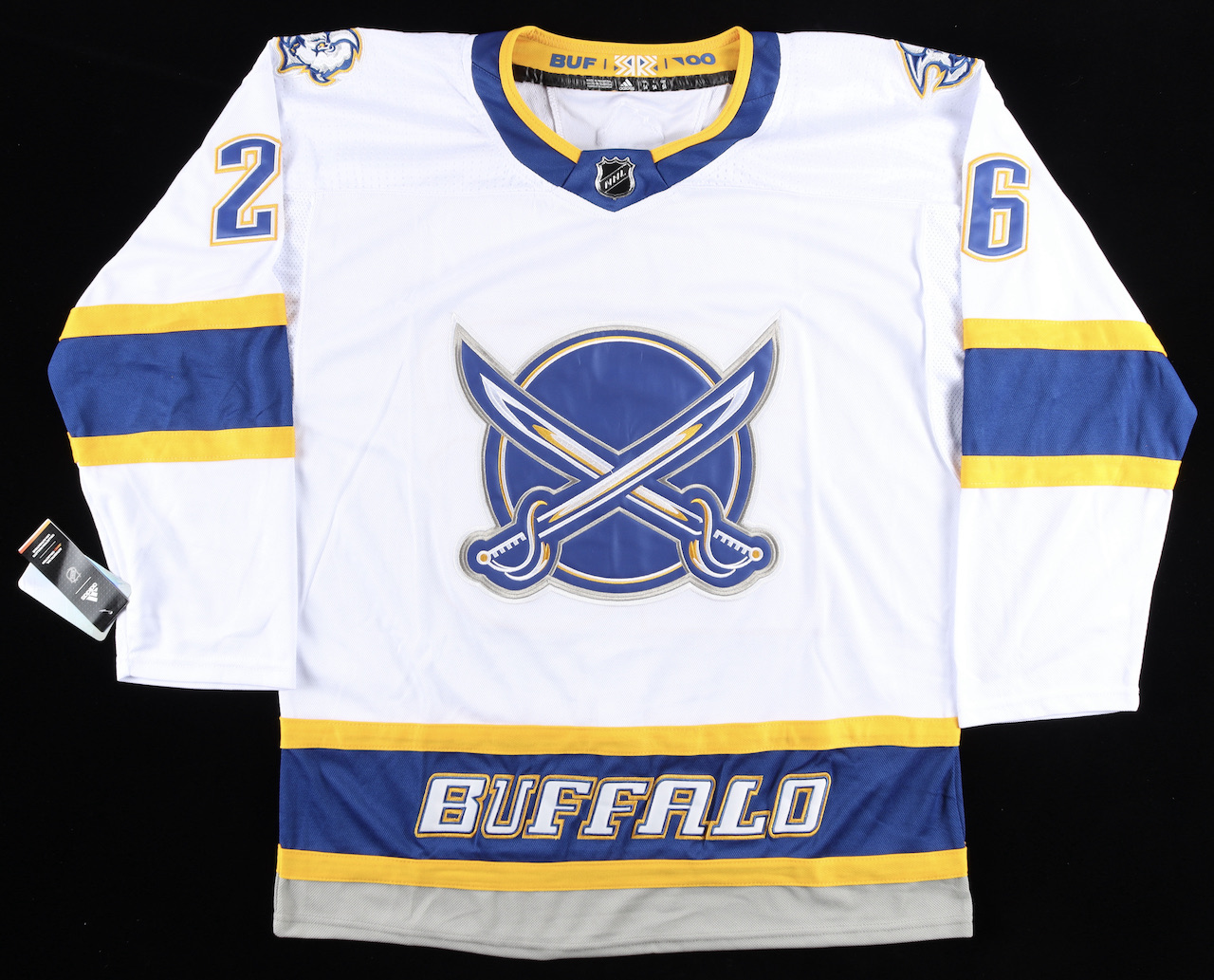 Adidas on-ice style jersey. Everything is sewn on, size 54. Hand-signed by Dylan Cozens (Buffalo Sabres). Please note, there is a stain on the reverse numbers.