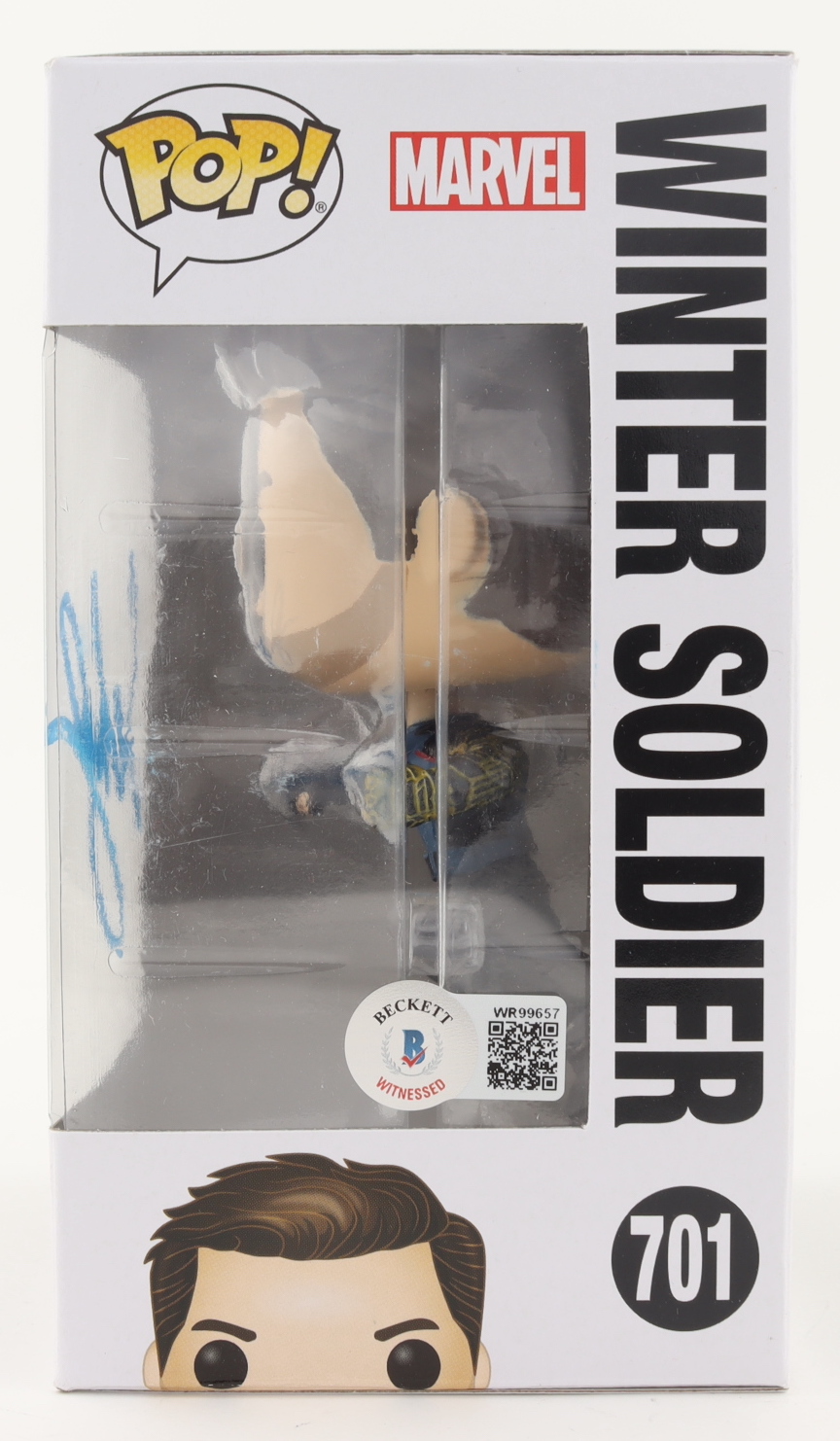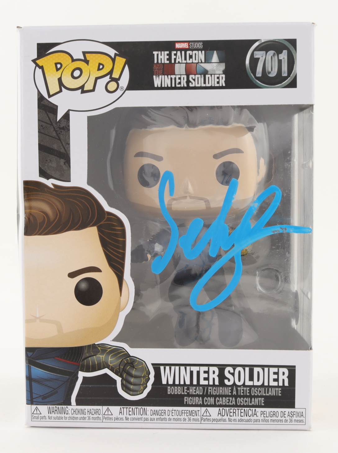Funko Pop! Vinyl Figure measures approximately 4" tall and has been hand-signed on the packaging by Sebastian Stan (James "Bucky" Barnes / Winter Soldier / White Wolf).