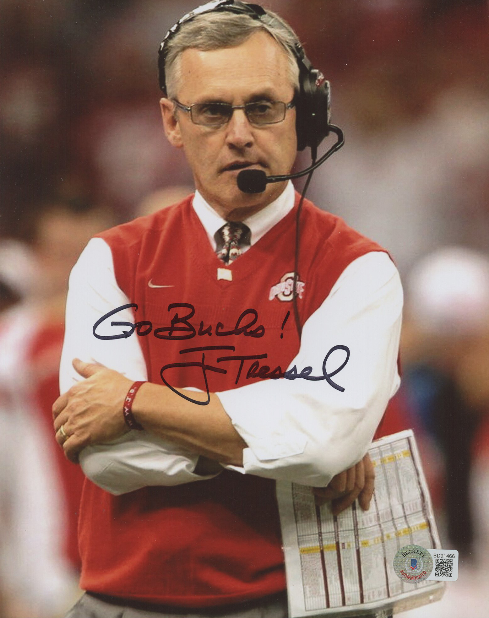 Jim Tressel Signed Ohio State Buckeyes 8x10 Photo Inscribed "Go Bucks!" (Beckett)