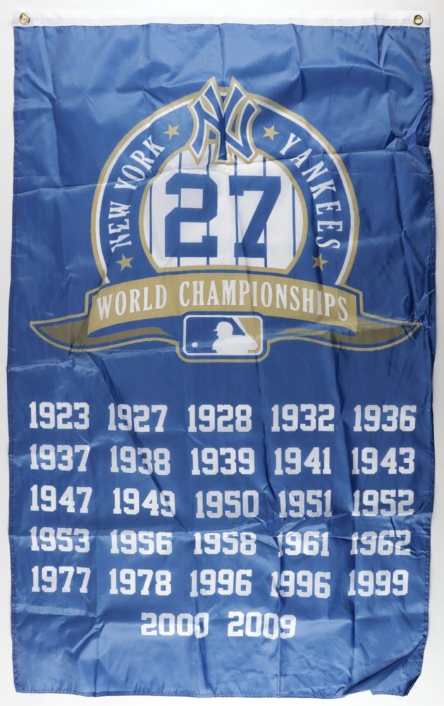 New York Yankees World Series champions replica banner measures 36" x 60" in size. Please note, the banner is unsigned, and see the photos for more details regarding the condition of the banner.