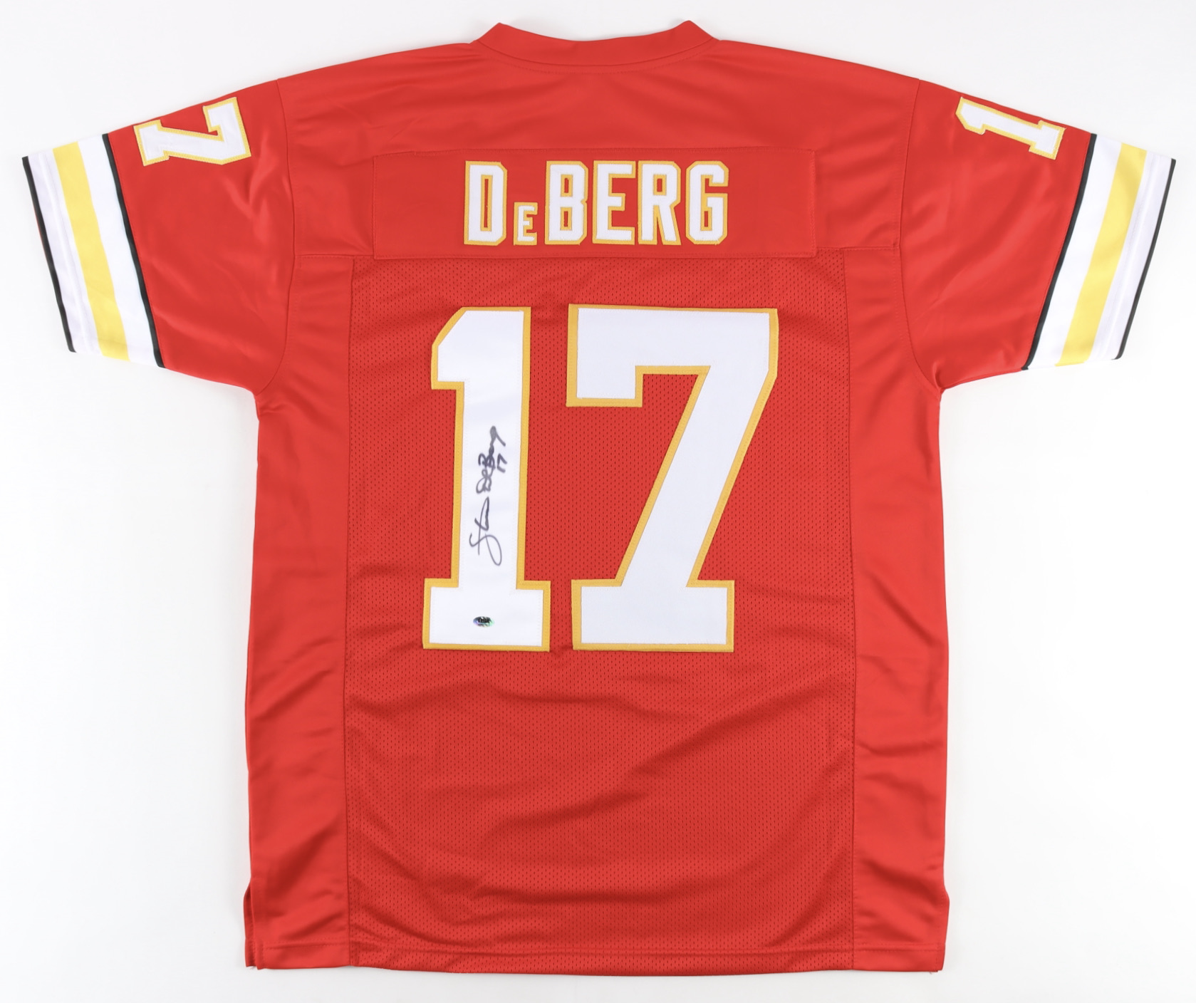 Custom on-field style jersey. Everything is sewn on, size XL. Hand-signed by Steve DeBerg.