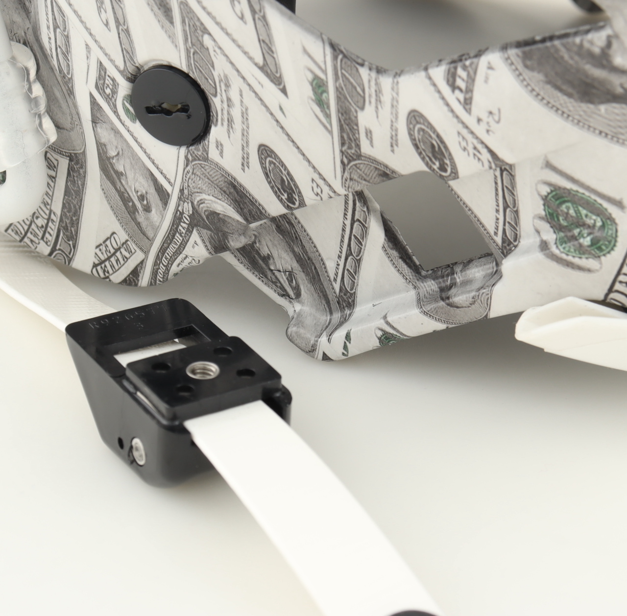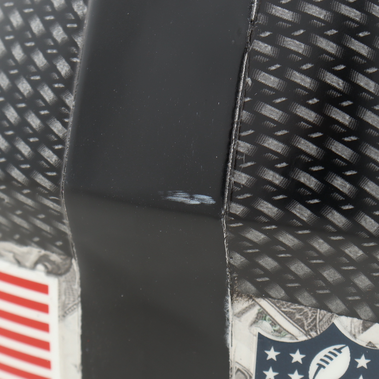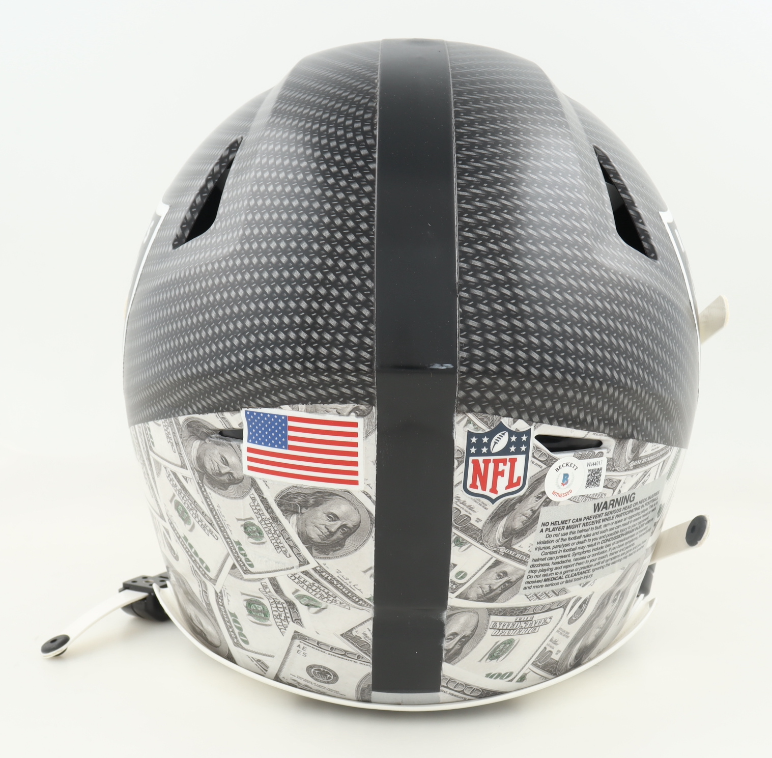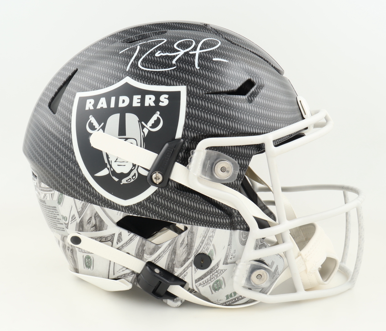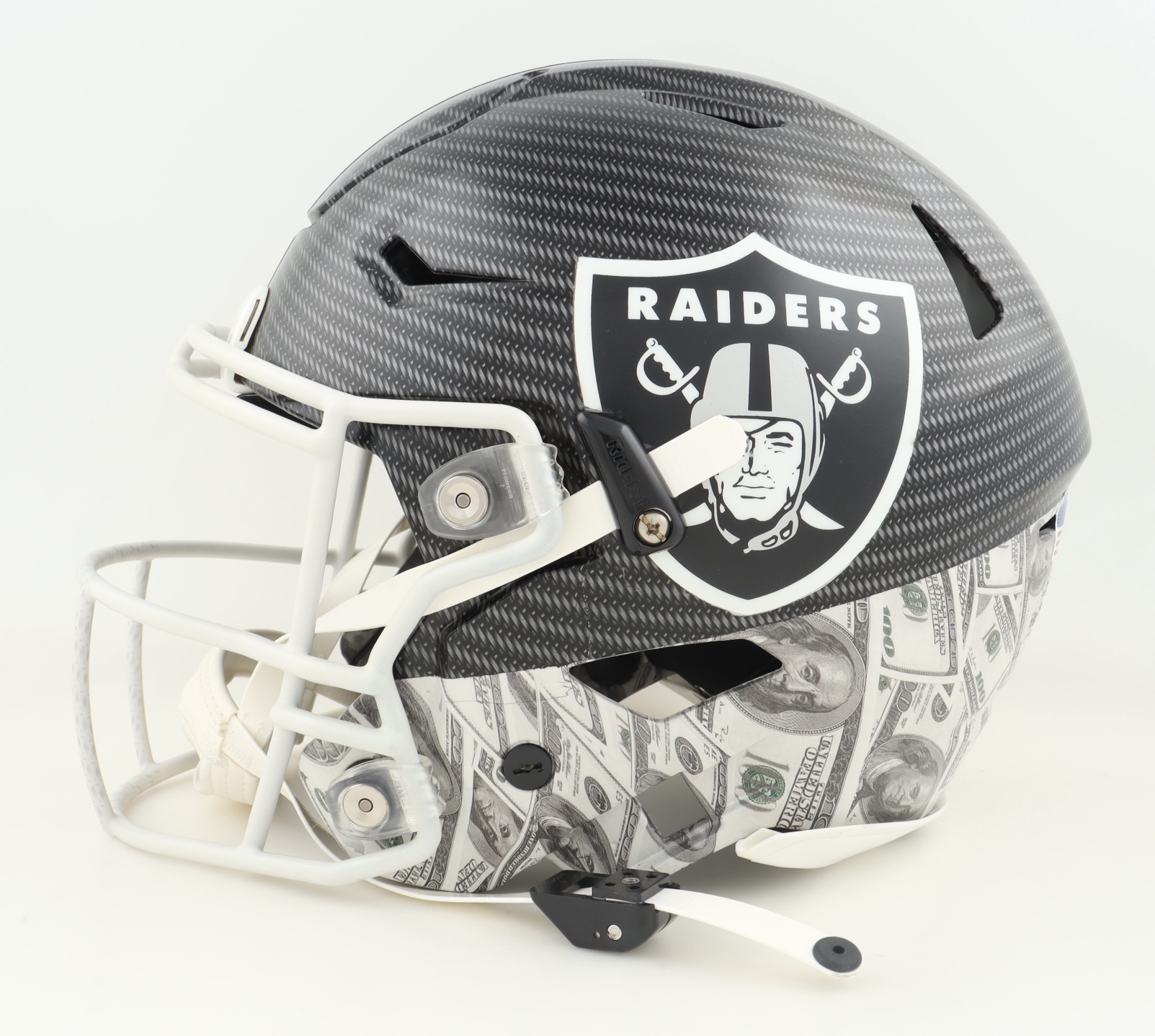 Riddell Oakland Raiders full-size authentic on-field Hydro-Dipped SpeedFlex Helmet has been hand-signed by Randy Moss (HOF). Please note, small scuffs on helmet, and the lower snap for the chinstrap on the left side of the helmet is missing.