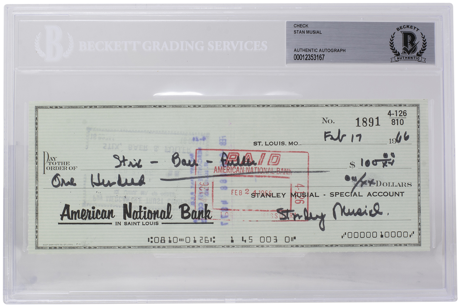 American National Bank personal check is dated February 17th, 1966. Hand-signed by Stan Musial (D. 2013, St. Louis Cardinals, HOF).