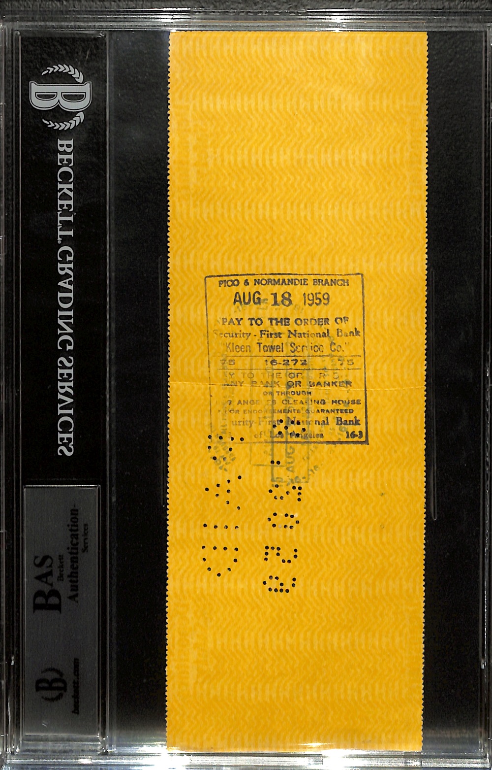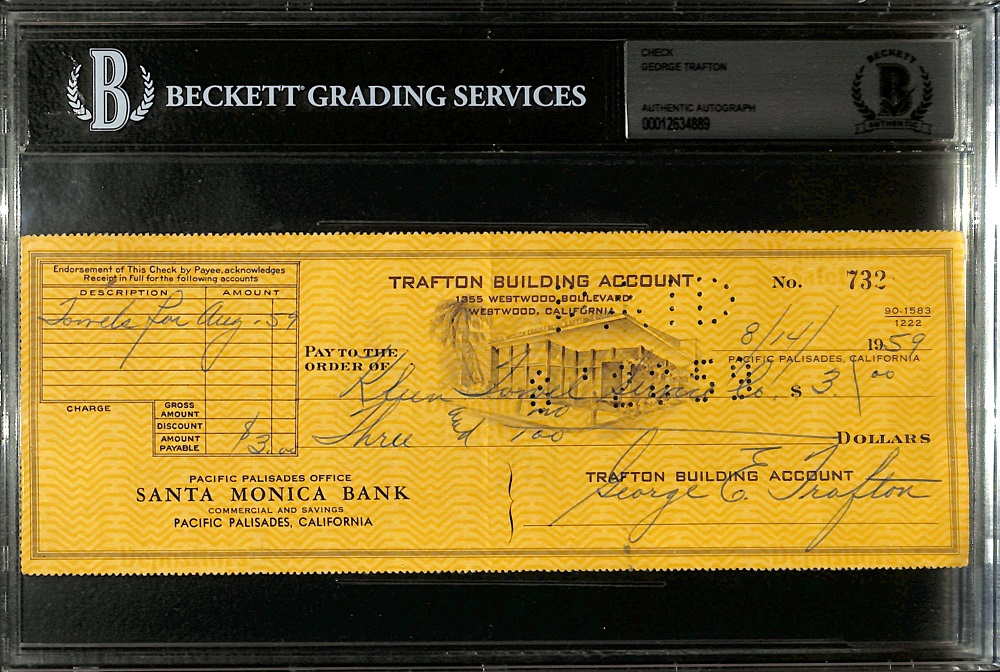 Santa Monica Bank personal check is dated August 14, 1959 and has been hand-signed by George Trafton (D. 1971, Chicago Bears, HOF). Please see photos for details regarding the condition of the check.