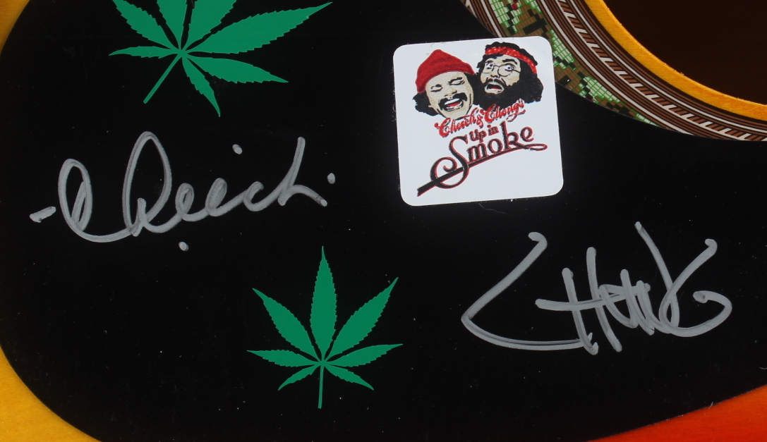Acoustic guitar measures approximately 38” in size and has been hand-signed on the pick-guard by Tommy Chong and Cheech Marin. Please note, guitar shows signs of handling and wear. See photos for more details regarding the condition of the guitar.