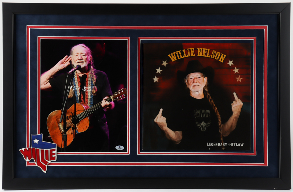 Custom frame measures 21" x 33" in size and features a photo that has been hand-signed by Willie Nelson. Display also features a "Willie Nelson - Legendary Outlaw" Vinyl Album Cover. Please see photos for details regarding the condition of the display.