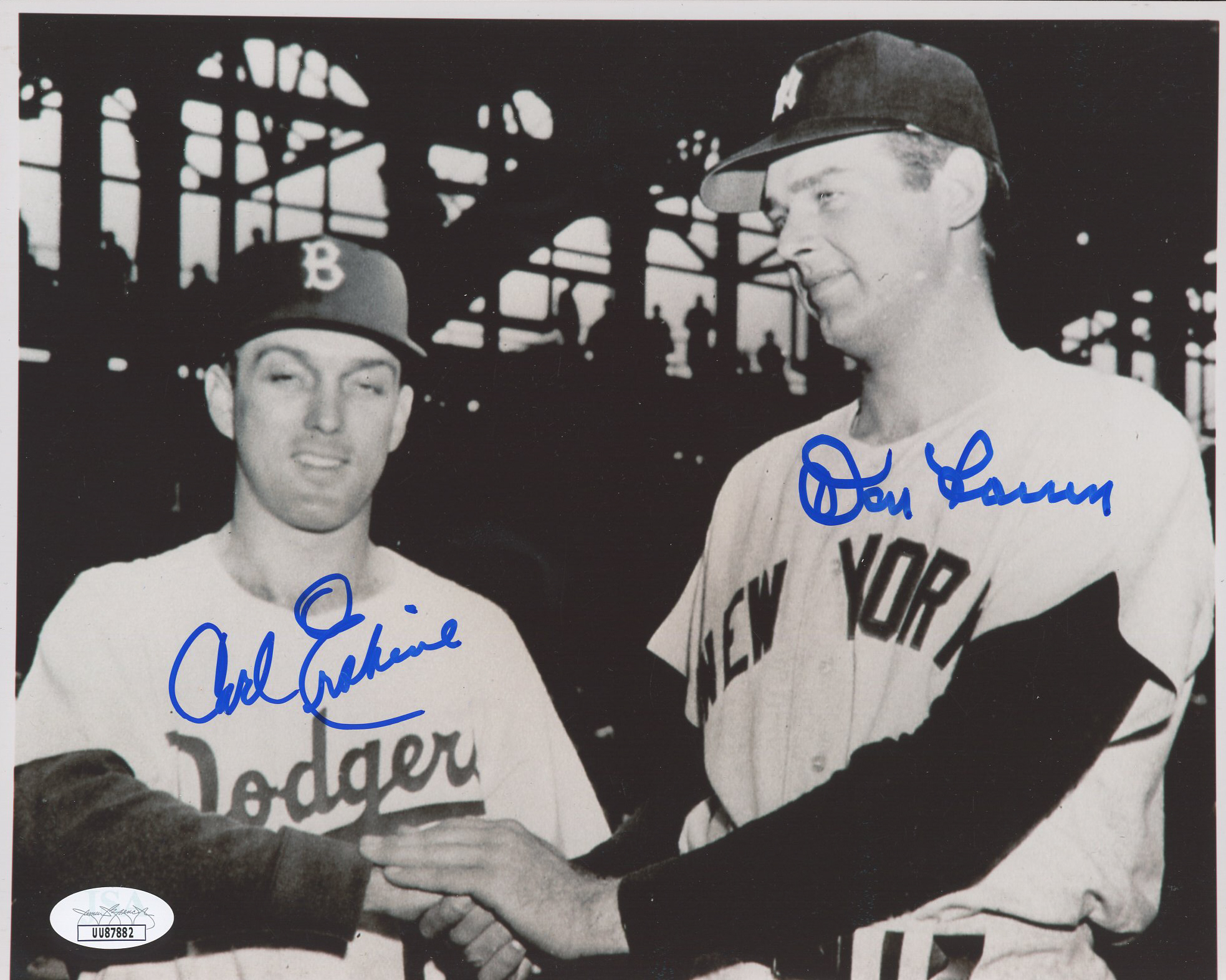 Photo measures 8" x 10" in size and has been hand-signed by Don Larsen (D. 2020, New York Yankees) and Carl Erskine (Brooklyn Dodgers).