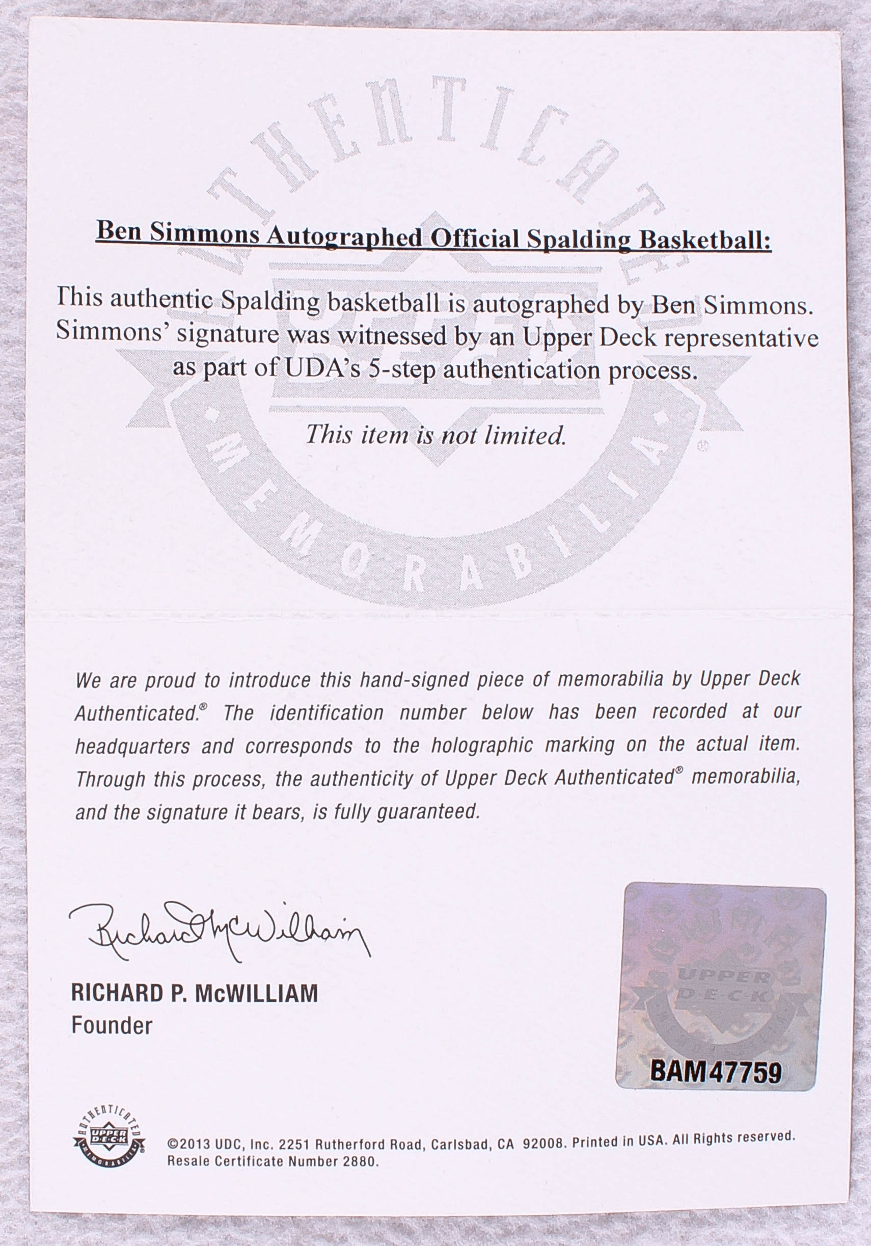 The autograph includes an official Upper Deck Authenticated (UDA) hologram and matching COA for authenticity purposes.Authentication: UDA COA