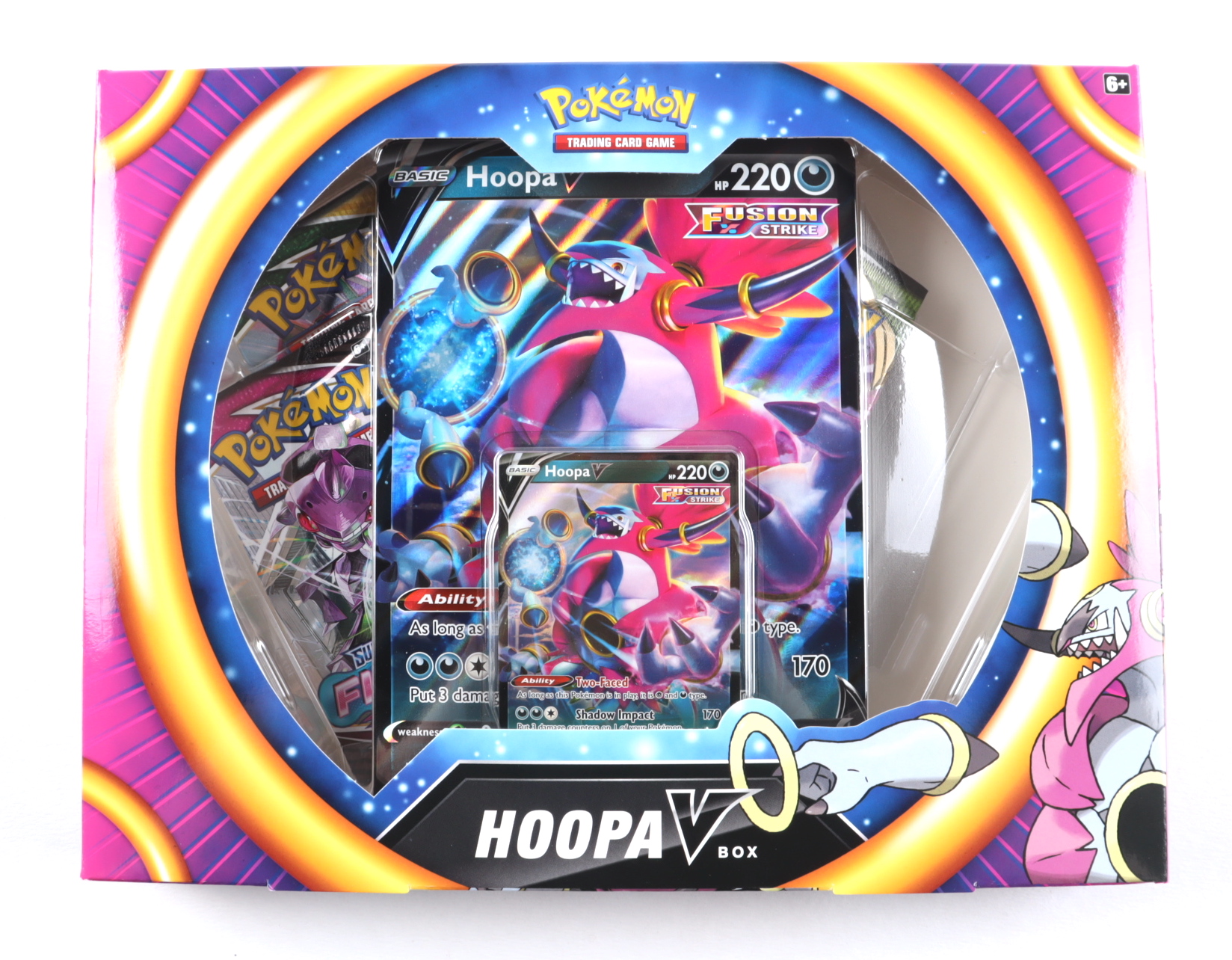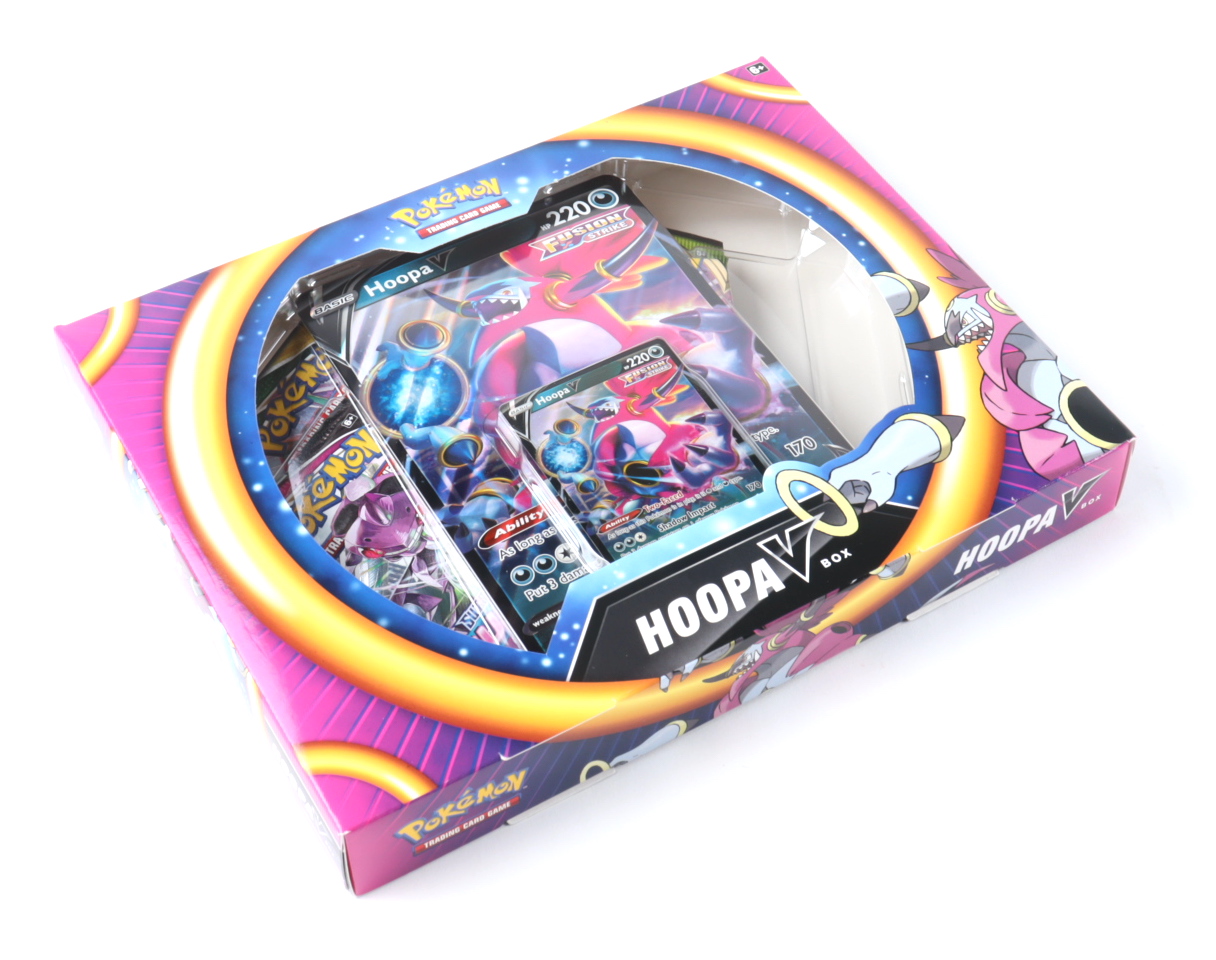 The Mythical Pokémon Hoopa has arrived as a powerful Pokémon V that's ready to juggle rings, reach across hyperspace, and find a place in your collection! The Pokémon TCG: Hoopa V Box includes the Fusion Strike Hoopa V whose Two-Faced Ability turns it into a Psychic- and Darkness-type Pokémon as long as it's in play (it's normally just a Darkness type). When the time comes for Hoopa V to unleash an attack, its Shadow Impact hits for 170 damage, but in return, you must place three damage counters on one of your Pokémon.