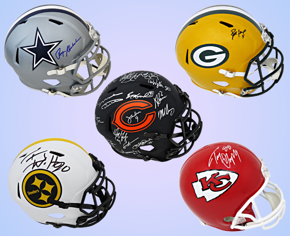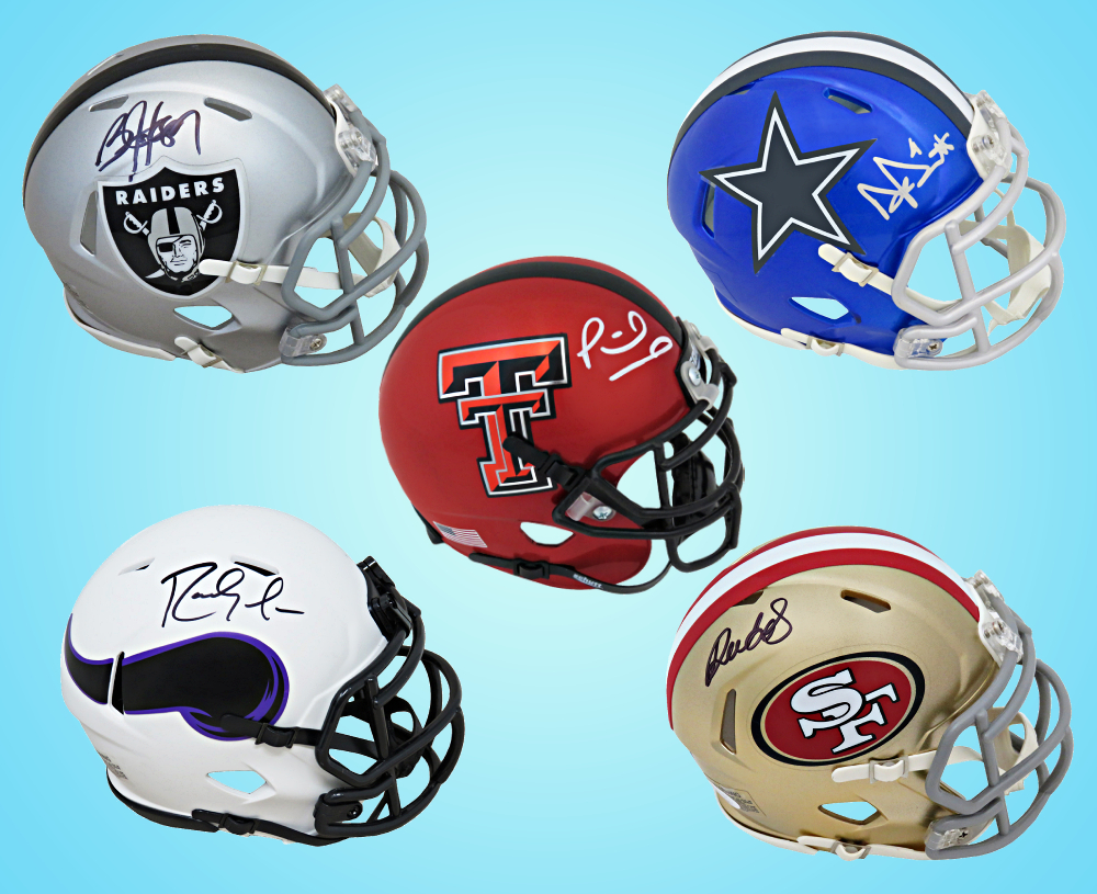 Each Football TOUCHDOWN Mystery Box contains at least six (6) autographed pieces of football memorabilia – a full-size helmet, custom football jersey, mini helmet, full-size football and two flats (photos/encapsulated cards). There are over 200 different Players included in this Series 11 Touchdown Mystery Box, which is a Pristine Exclusive Edition that is limited to 150 boxes.