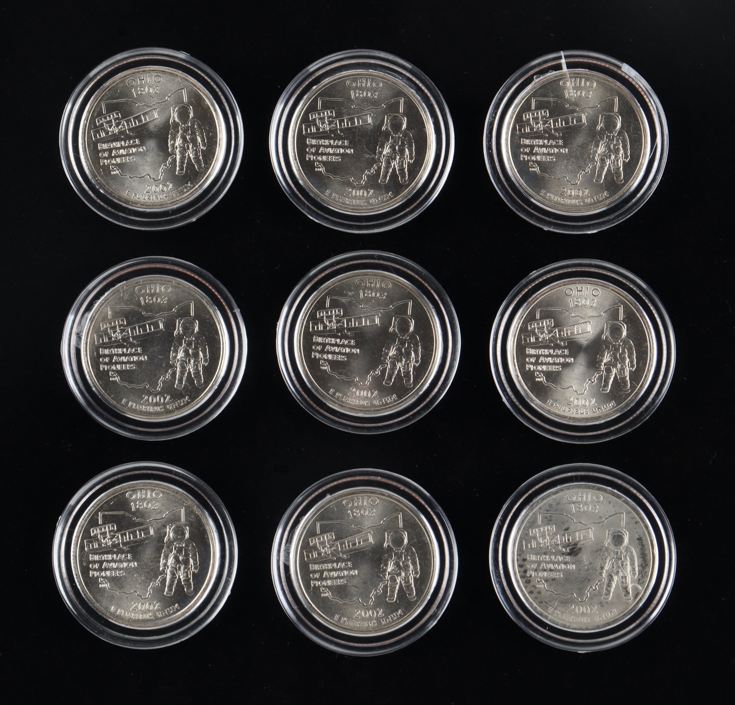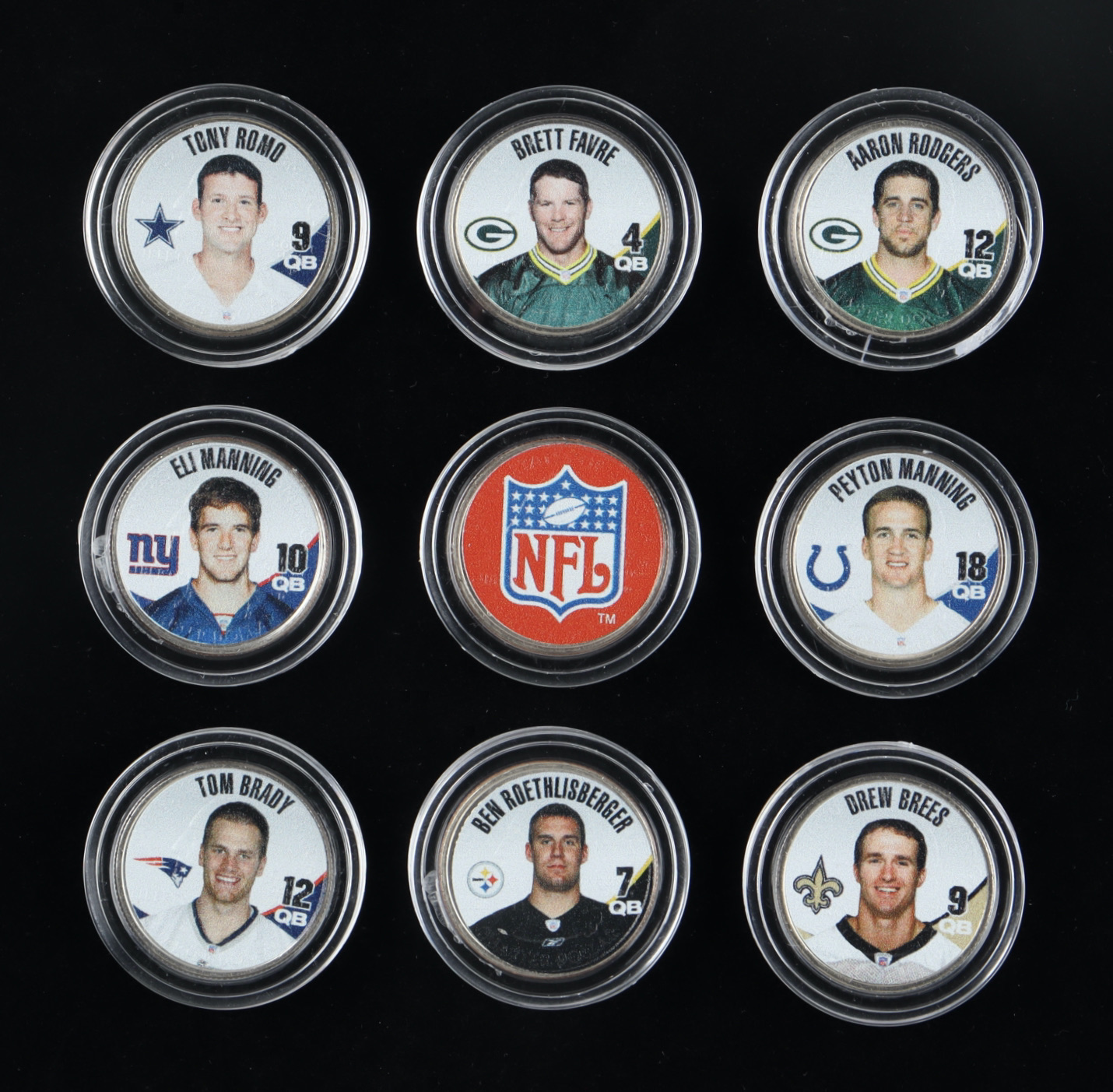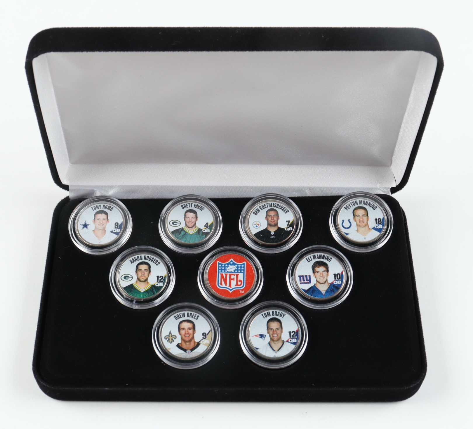 2002 U.S. NFL Colorized Ohio Football Coin Collector's Set of (9) Coins with Brett Favre, Peyton Manning, Tom Brady, Aaron Rodgers, Eli Manning with Display Case