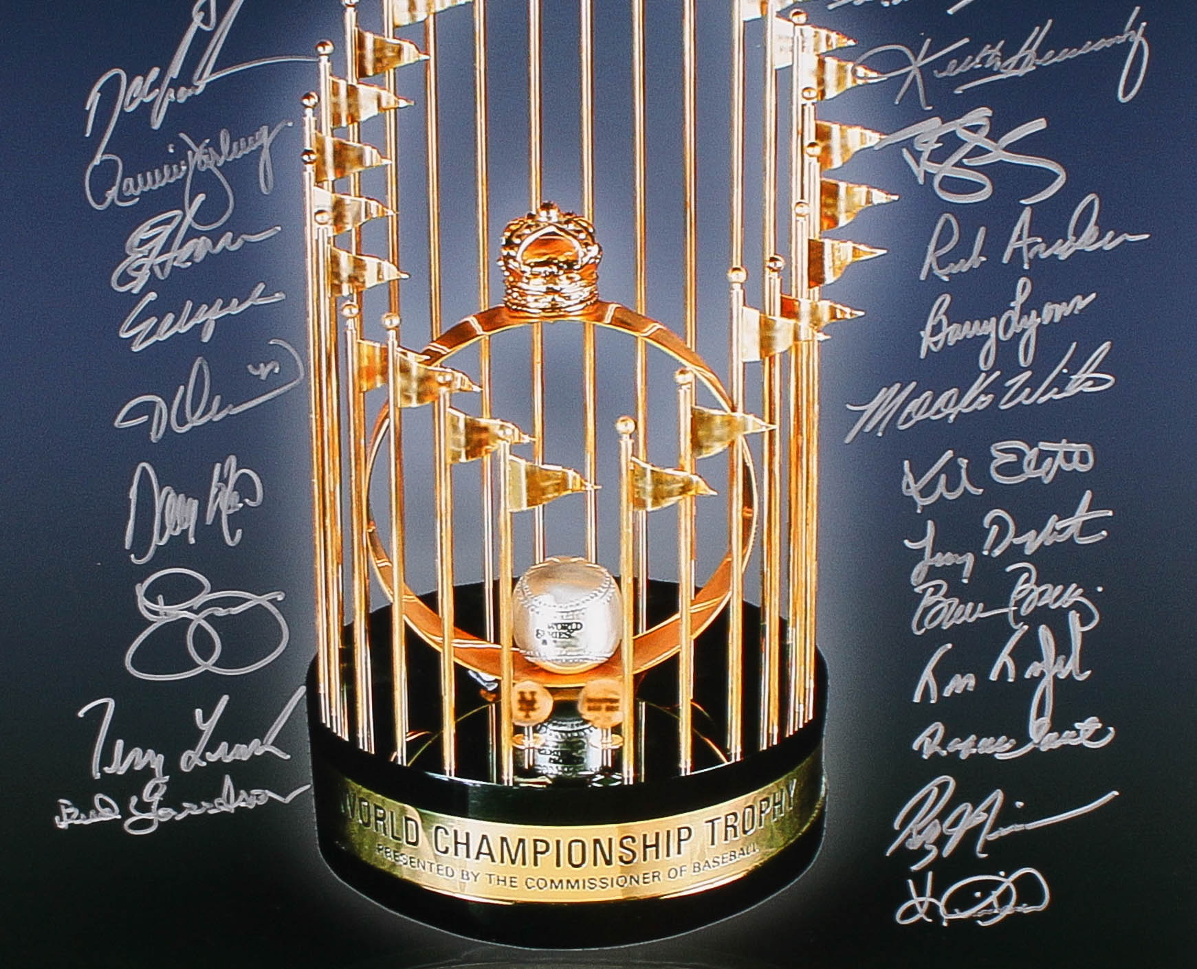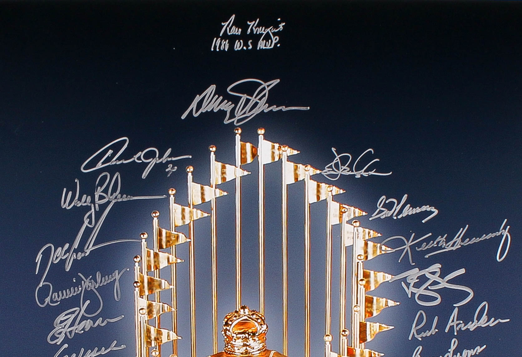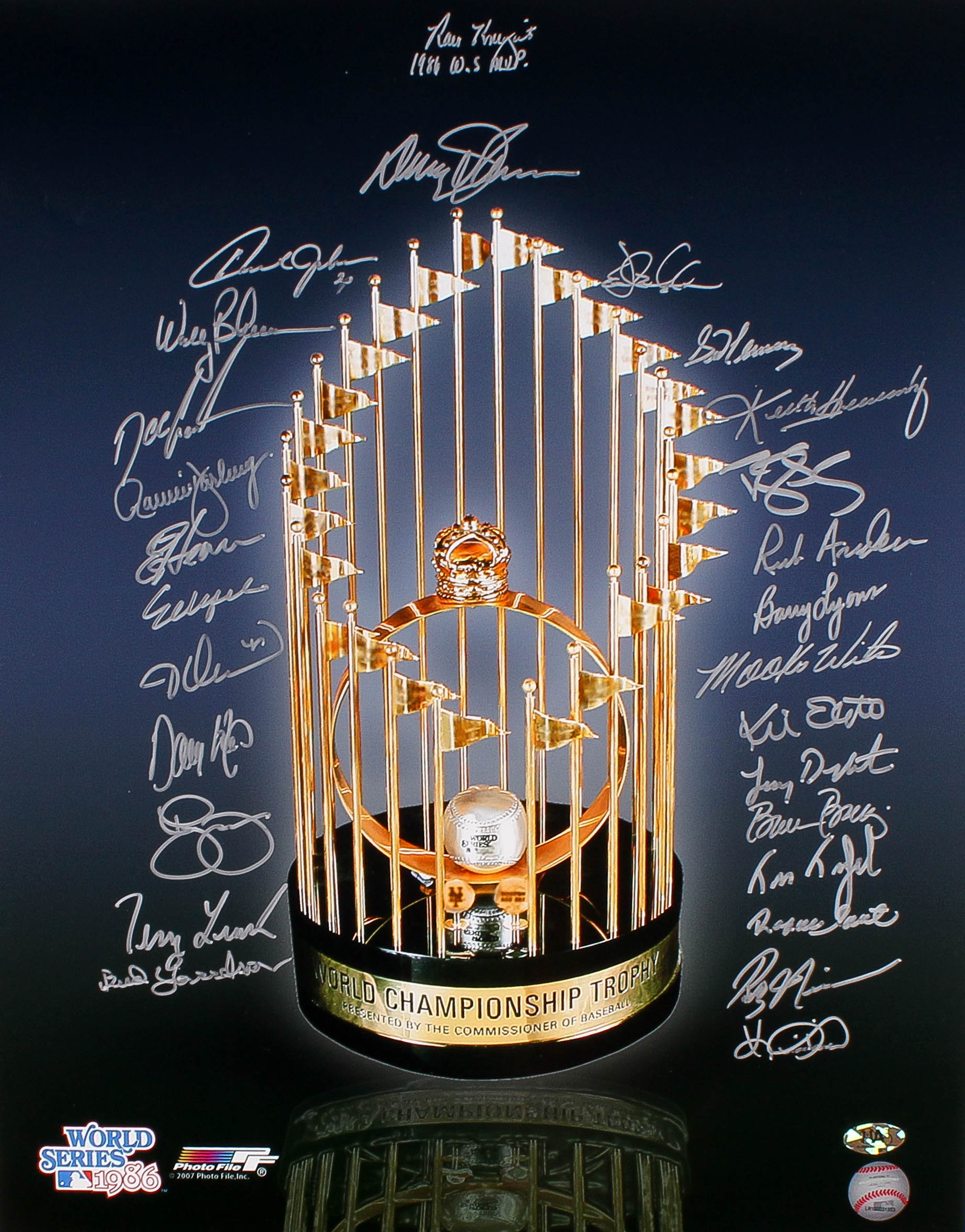 Photo measures 16" x 20" and has been hand signed in silver paint pen by (27) members of the 1986 New York Mets including, Dwight Gooden, Darryl Strawberry, Lenny Dykstra, Mookie Wilson, Bud Harrelson, Jesse Orosco, Rick Anderson, Wally Backman, Bruce Berenyi, Ron Darling, Kevin Elster, Sid Fernandez, Ed Hearn, Barry Lyons, Randy Neiman, and others.