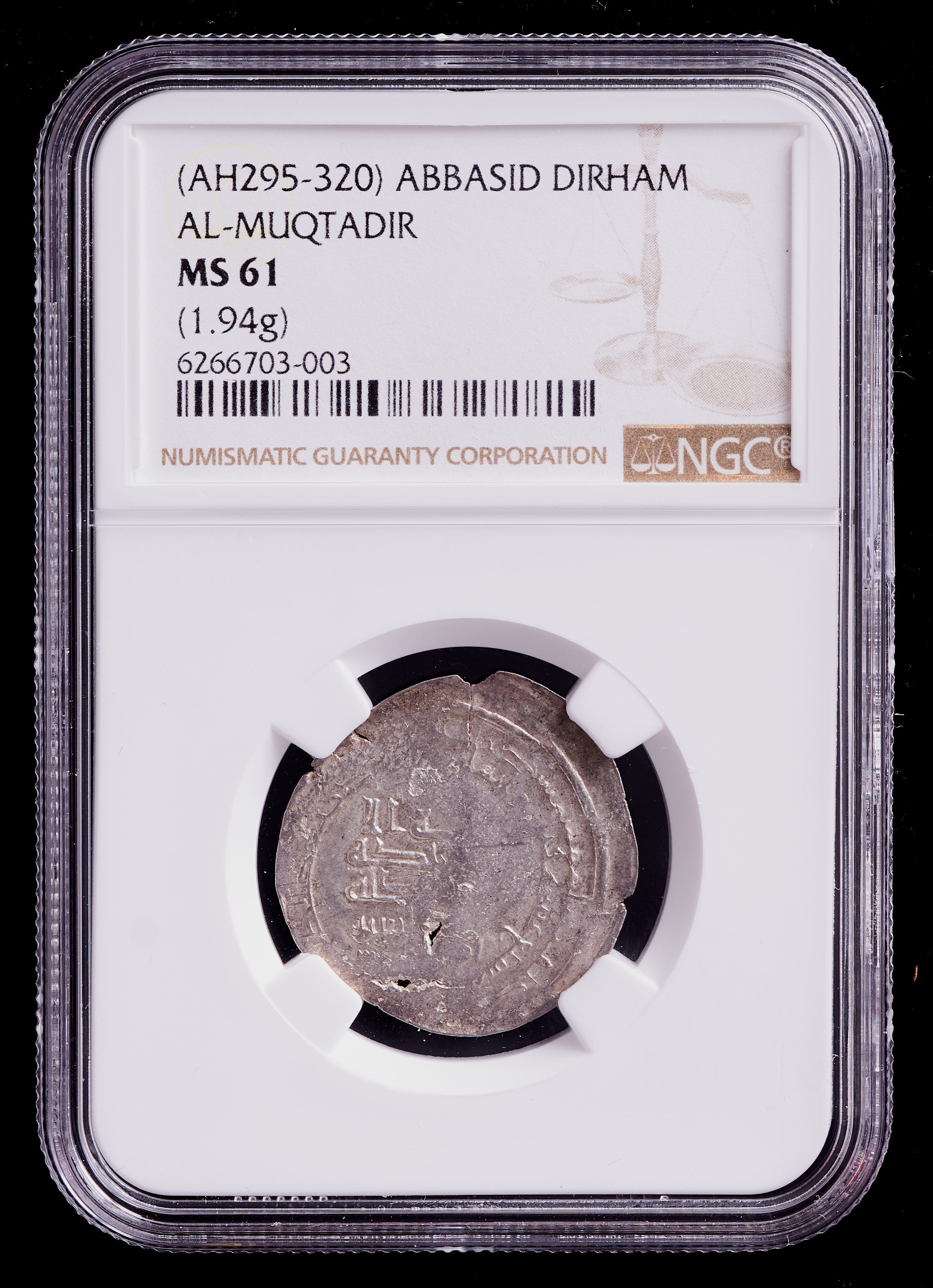 Al-Muqtadir (908-932) Islamic Kingdoms, Abbasid Caliphs Dirham Medieval Silver Coin (NGC MS61)