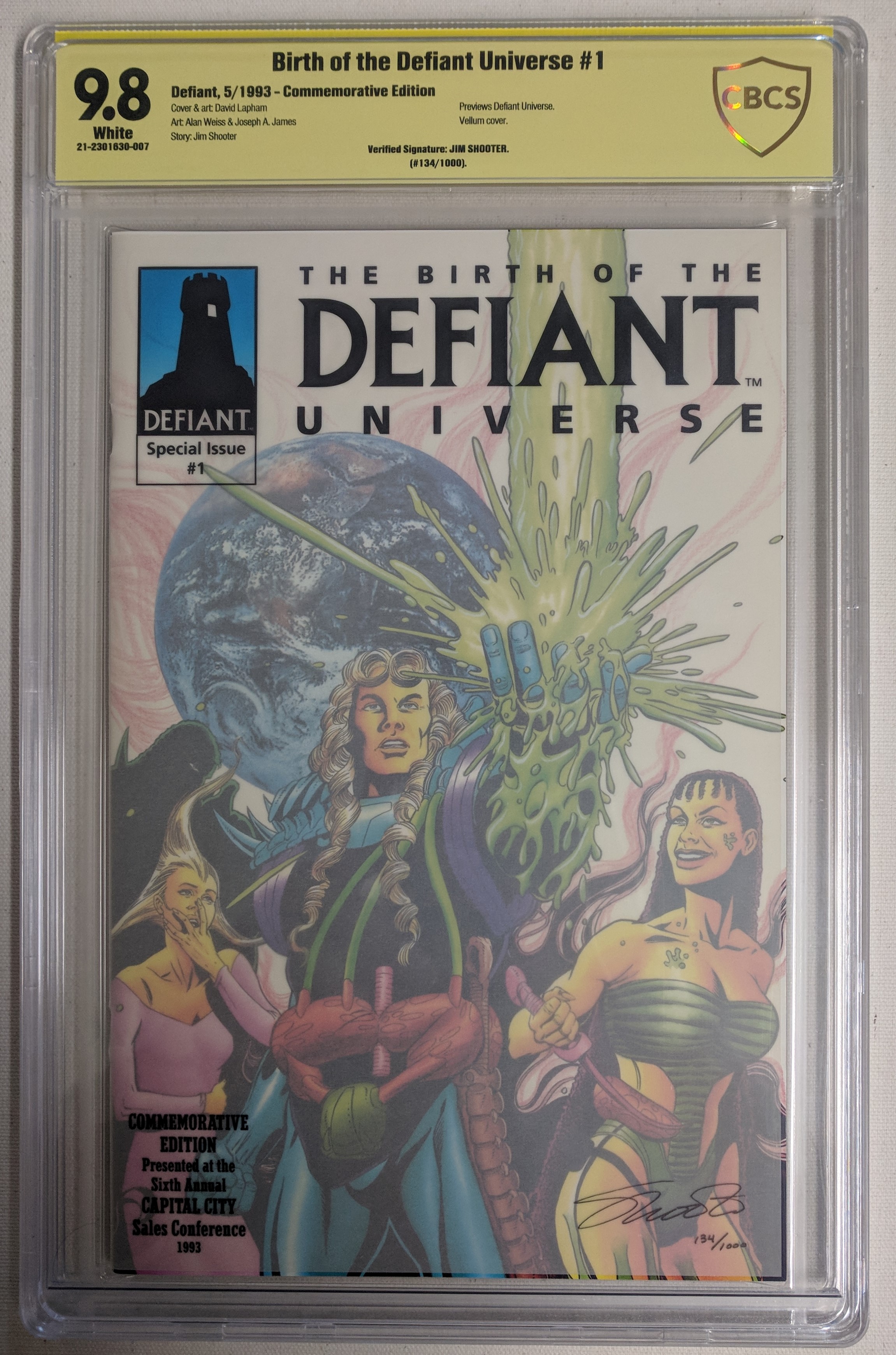 May 1993 "Birth of the Defiant Universe" Issue #1 Commemorative Edition Defiant Comic Book has been hand-signed by Jim Shooter (Comic Book Artist). The comic book has been given a grade of (CBCS) 9.8.