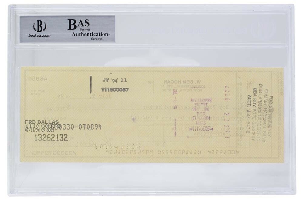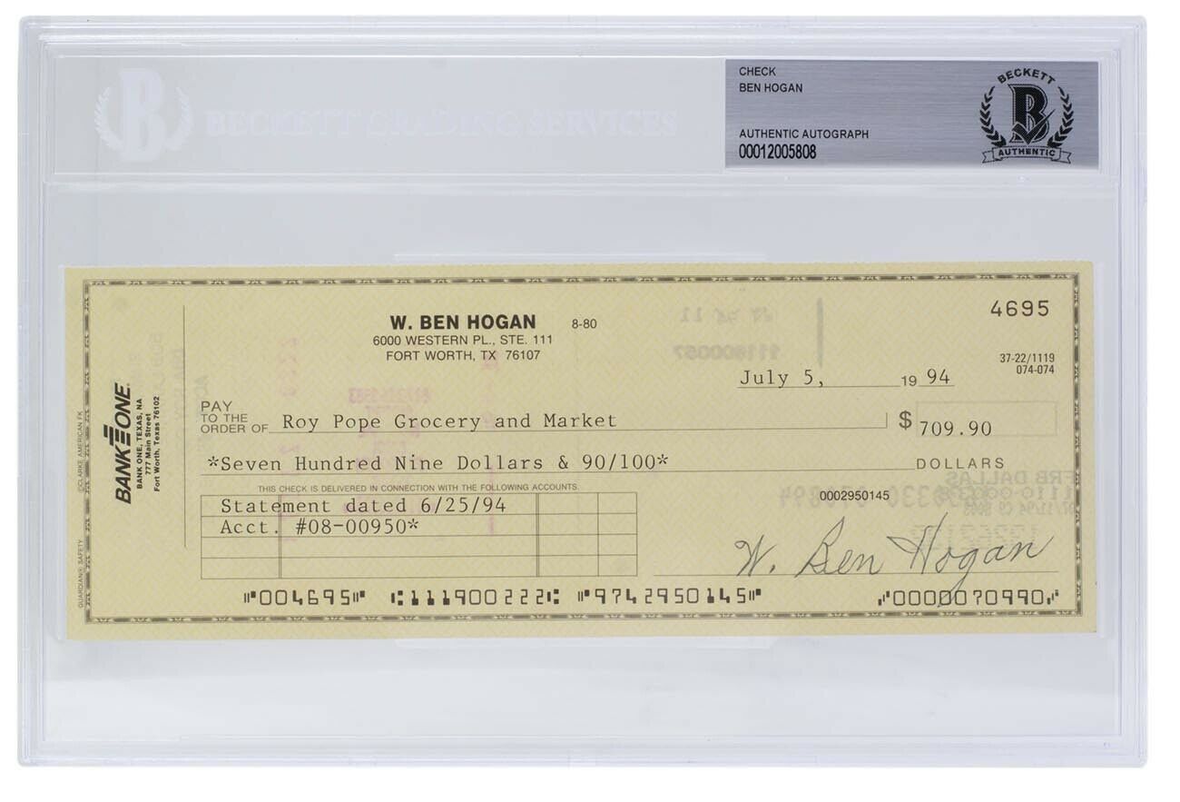 Personal bank check from Bank One is dated July 5, 1994. Hand-signed by Ben Hogan (D. 1997, HOF).