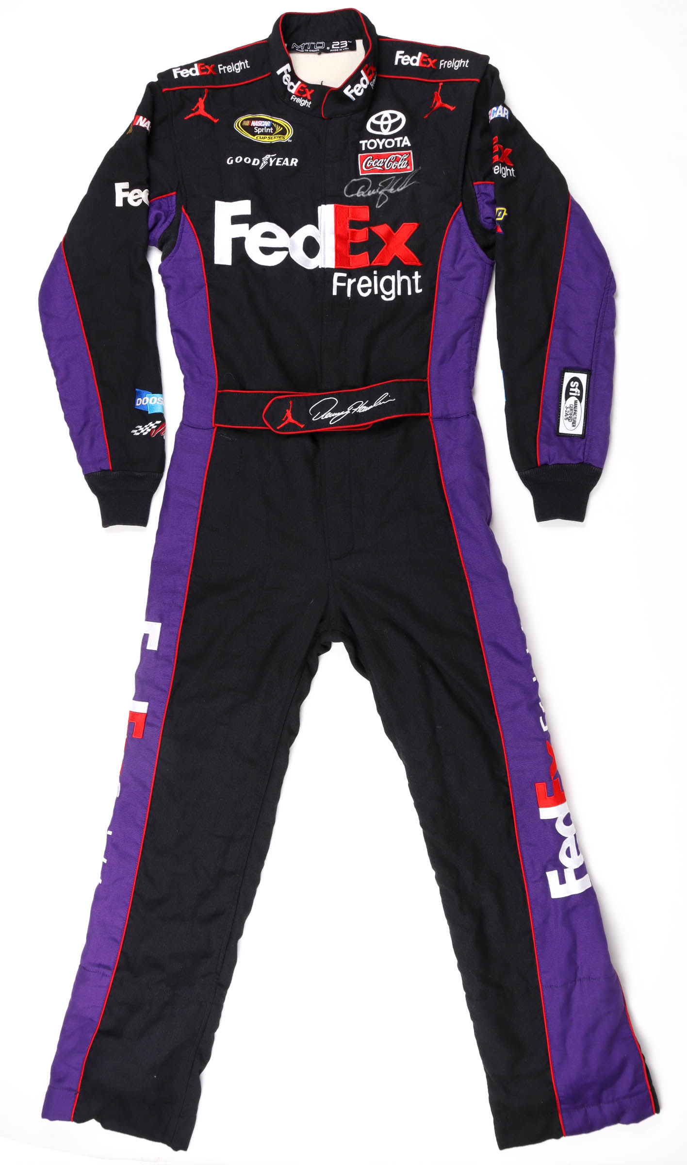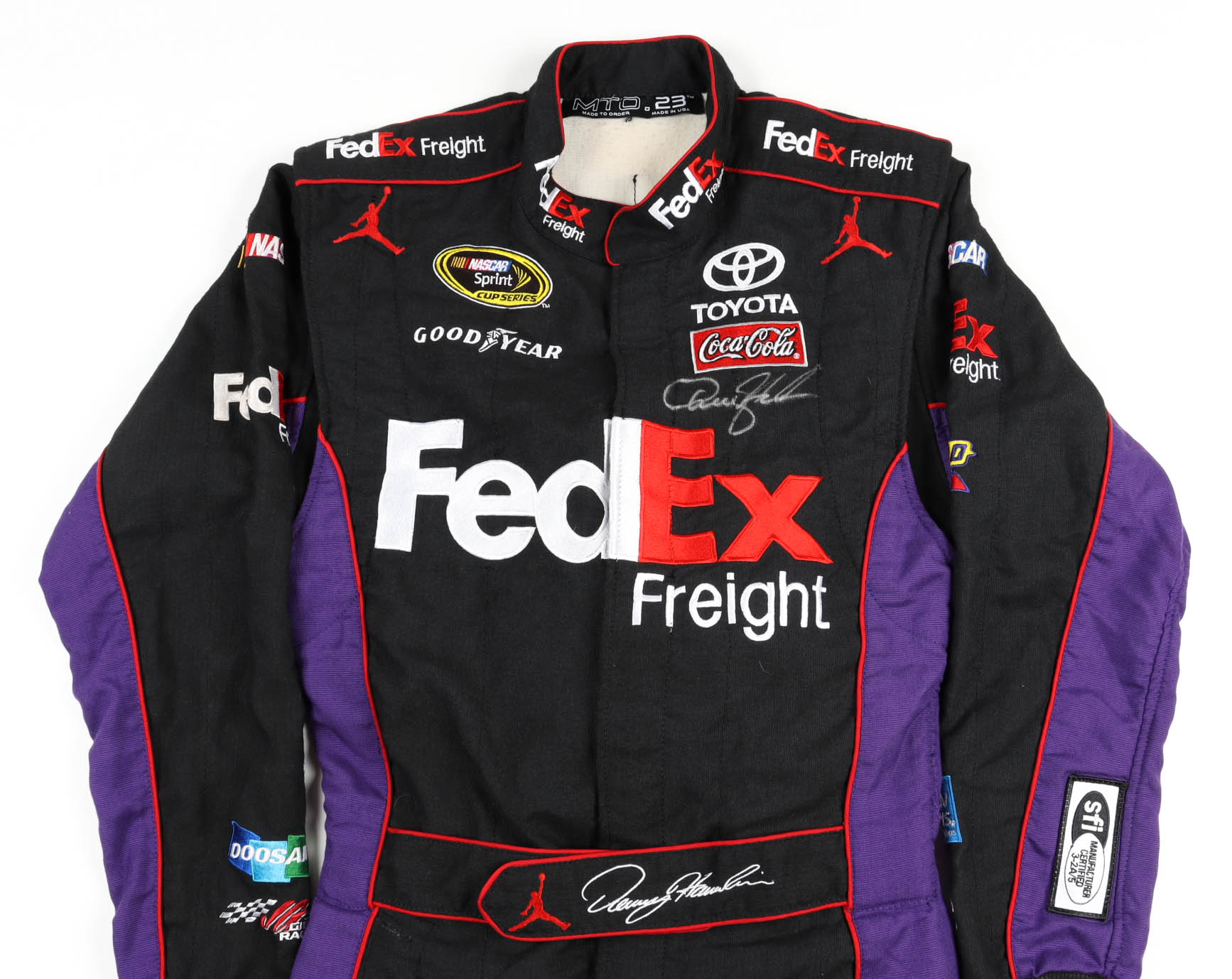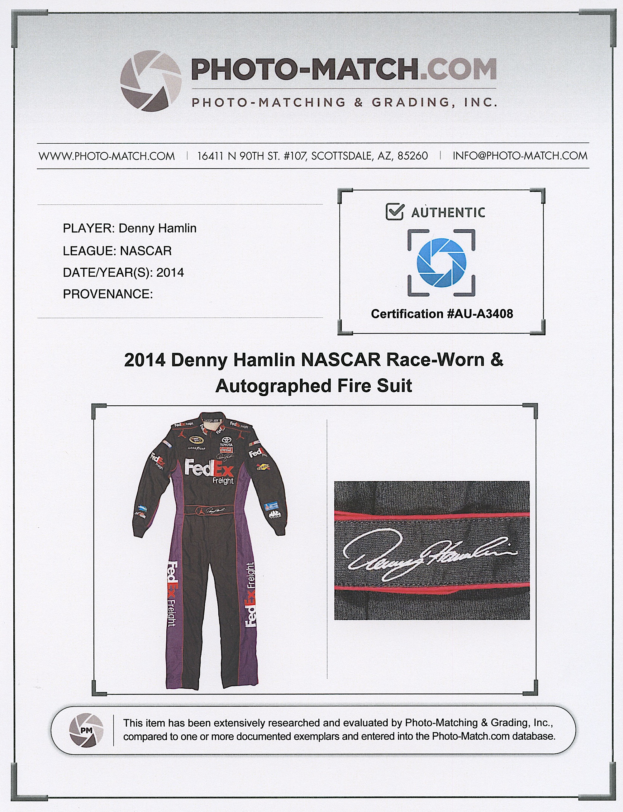 Denny Hamlin Signed & Race-Used 2014 NASCAR Cup Series FedEx Driver's Suit (Photo-Match.com)