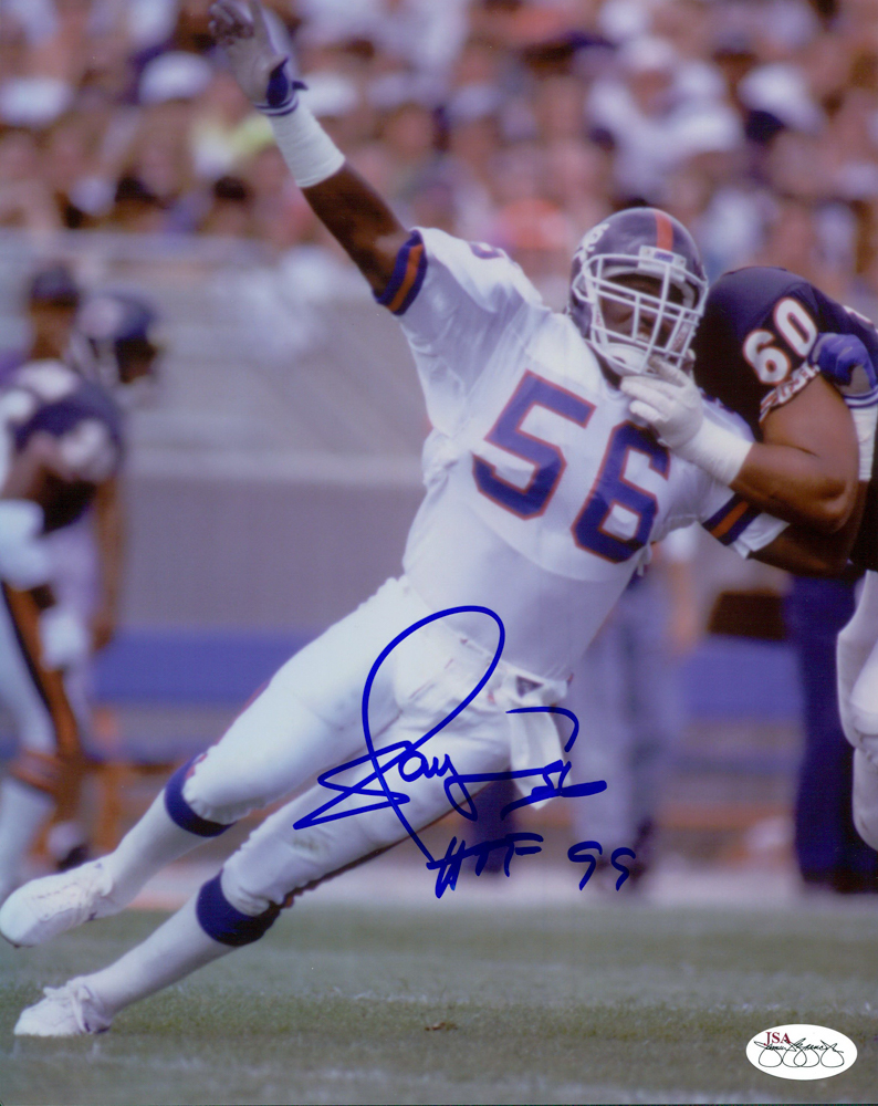 Photo measures 8" x 10" in size and has been hand-signed in blue felt-tip pen by Lawrence Taylor (HOF).