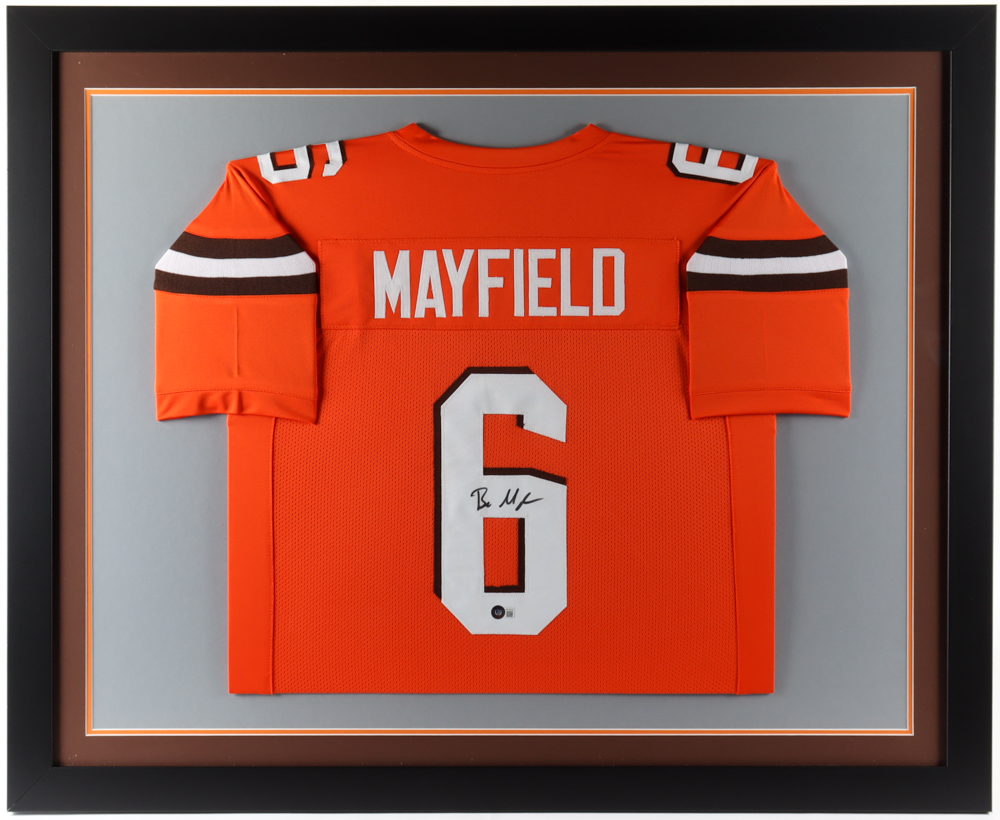Custom frame measures 35.5" x 43.5" in size and features a jersey that has been hand-signed by Baker Mayfield.