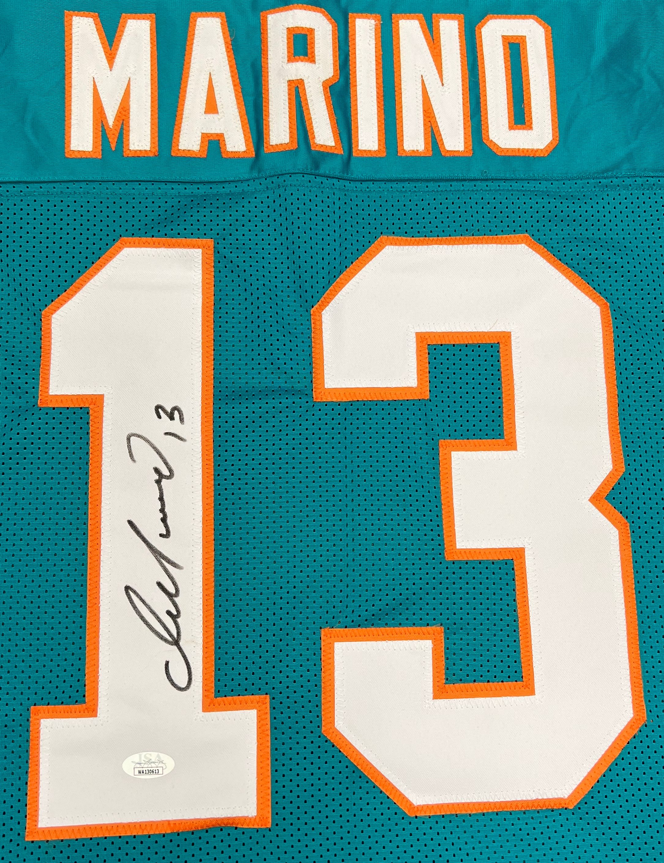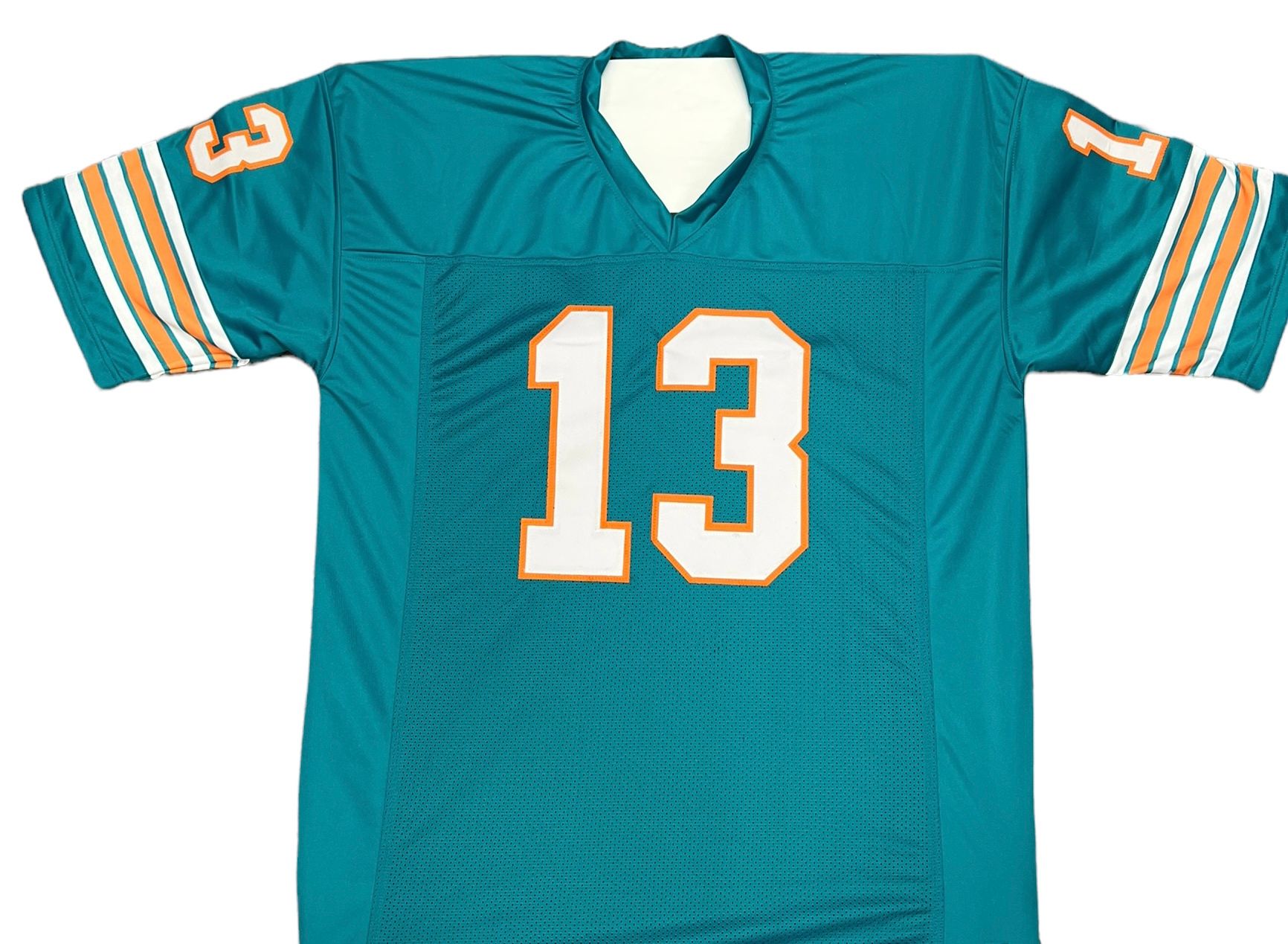 Custom on-field style jersey. Everything sewn on, size XL. Hand-signed by Dan Marino (HOF).