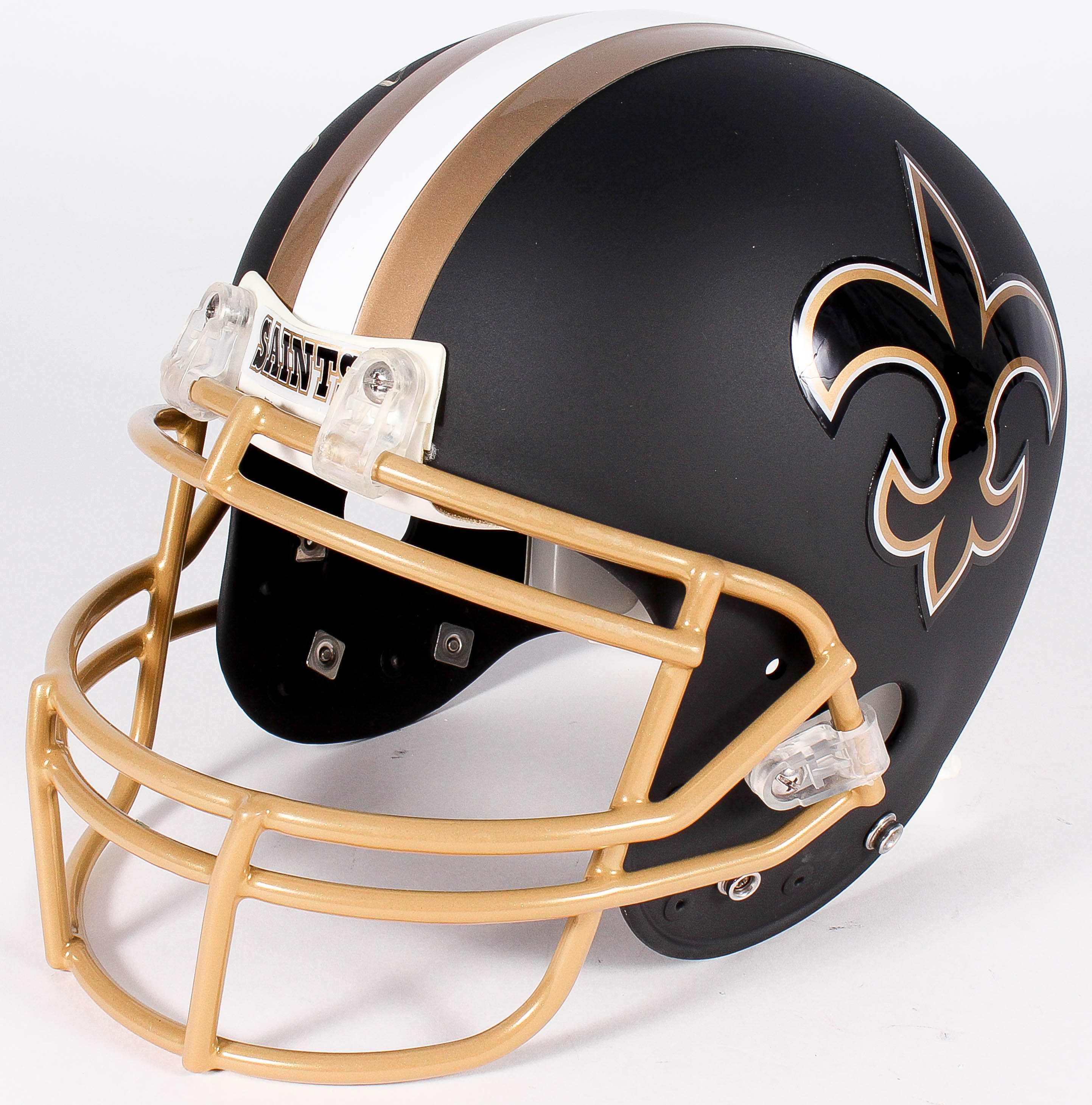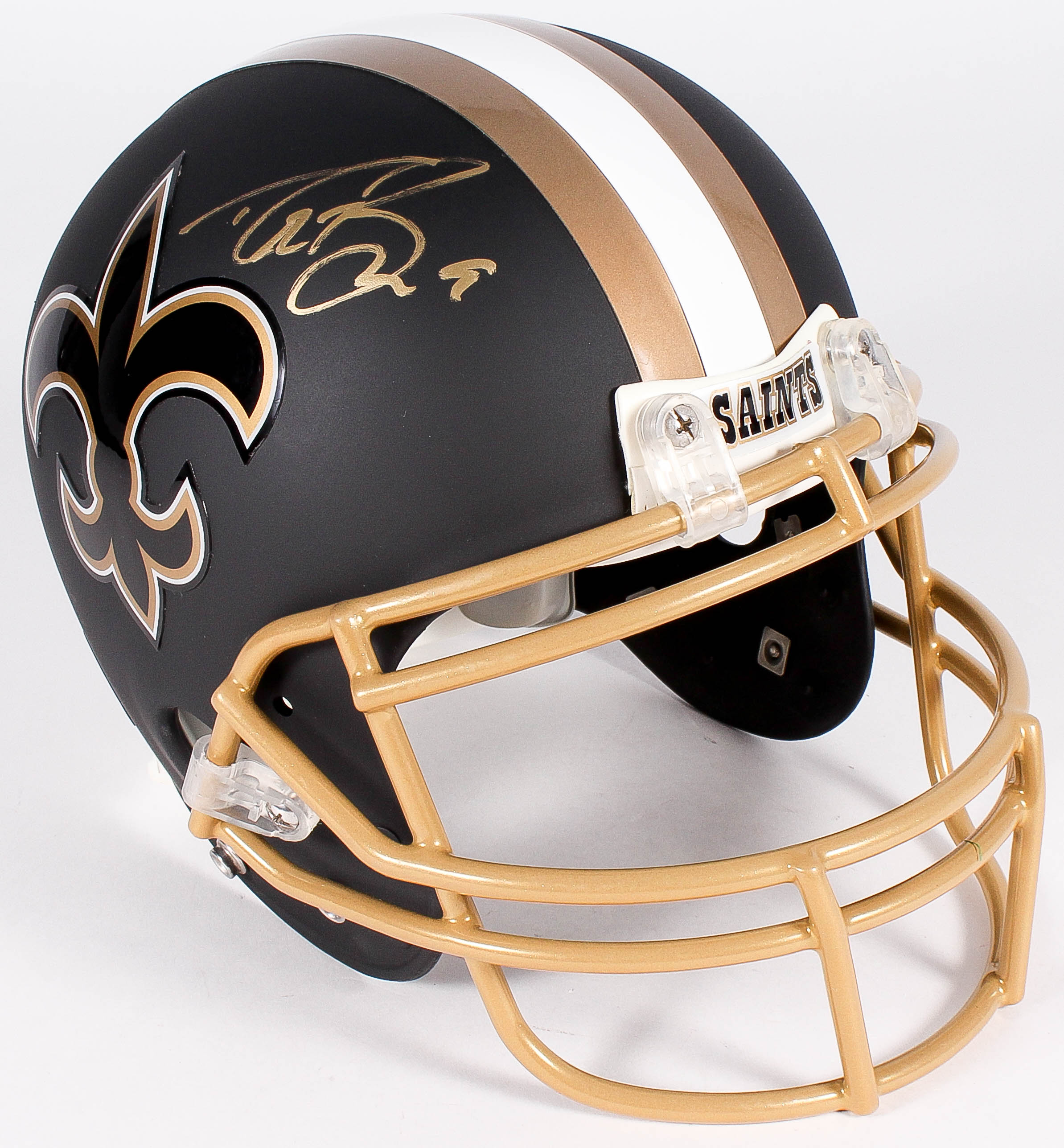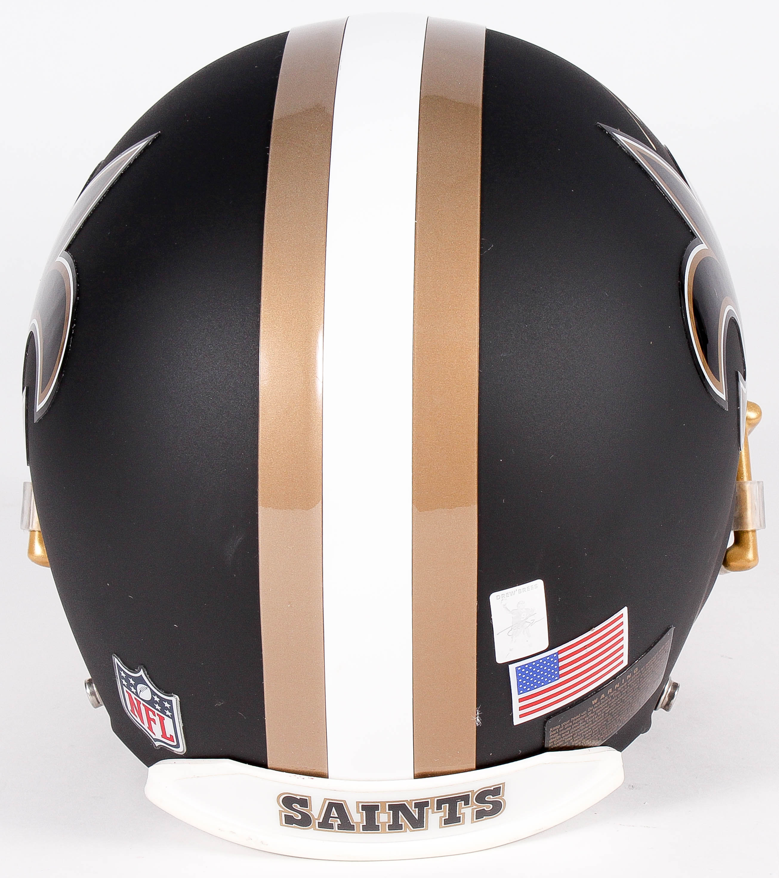 Saints custom matte black full size authentic proline helmet. Hand-signed in gold paint pen by Drew Brees.