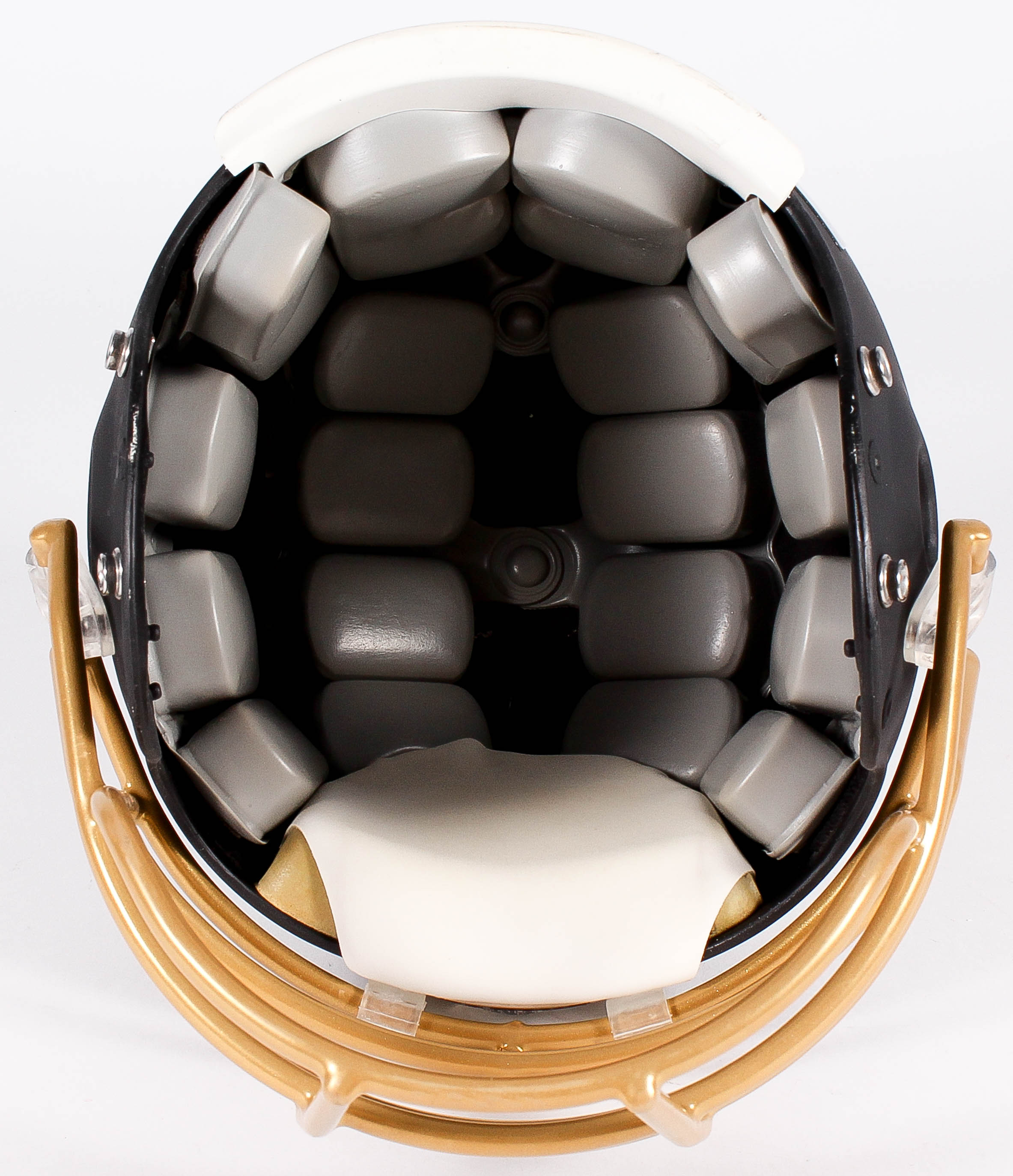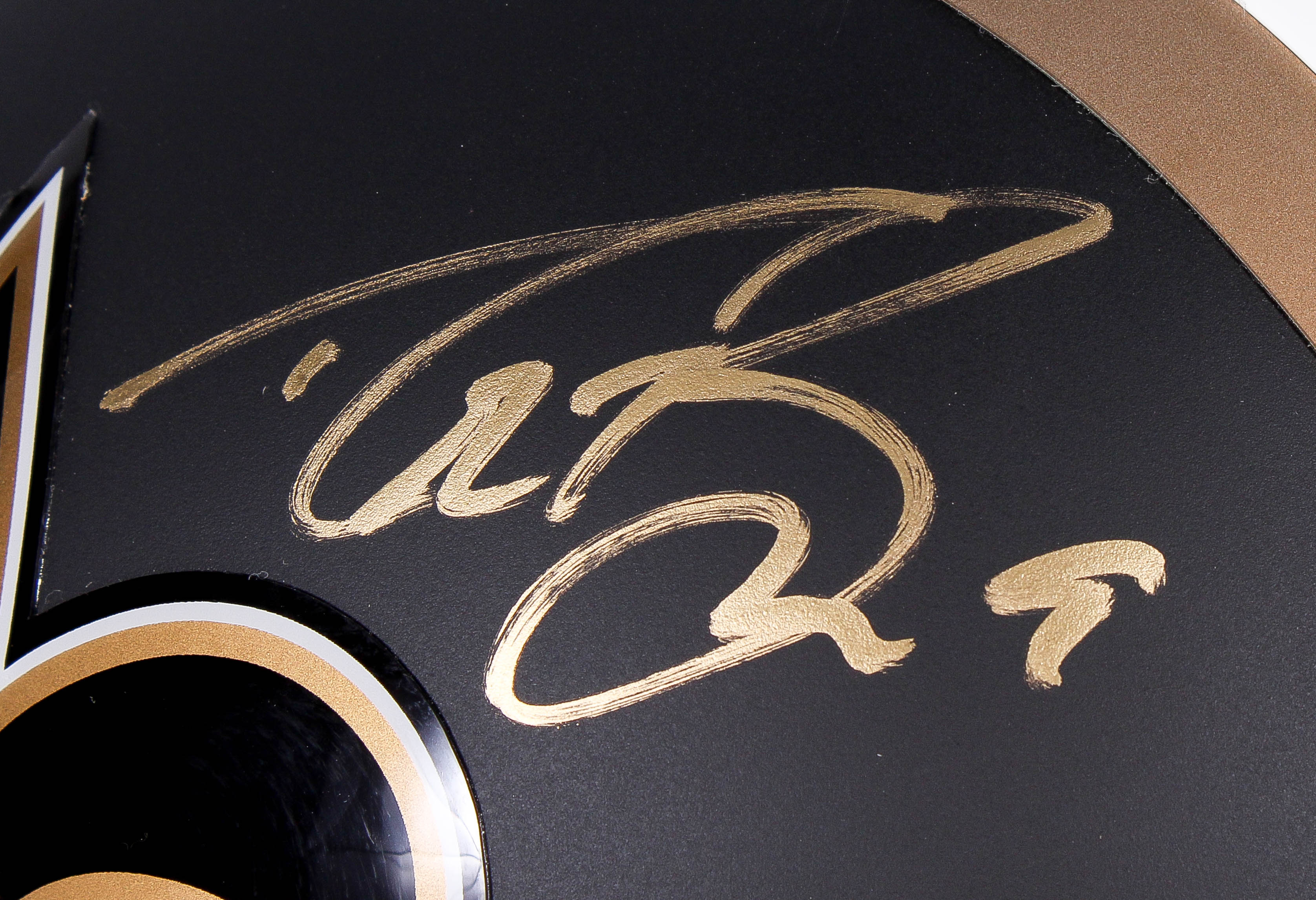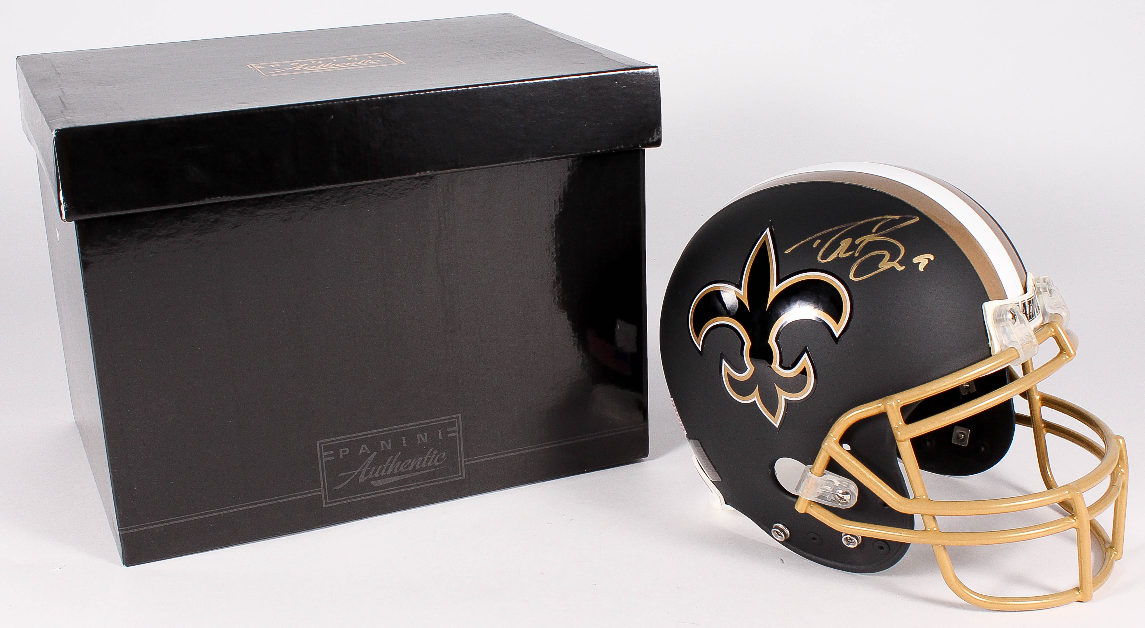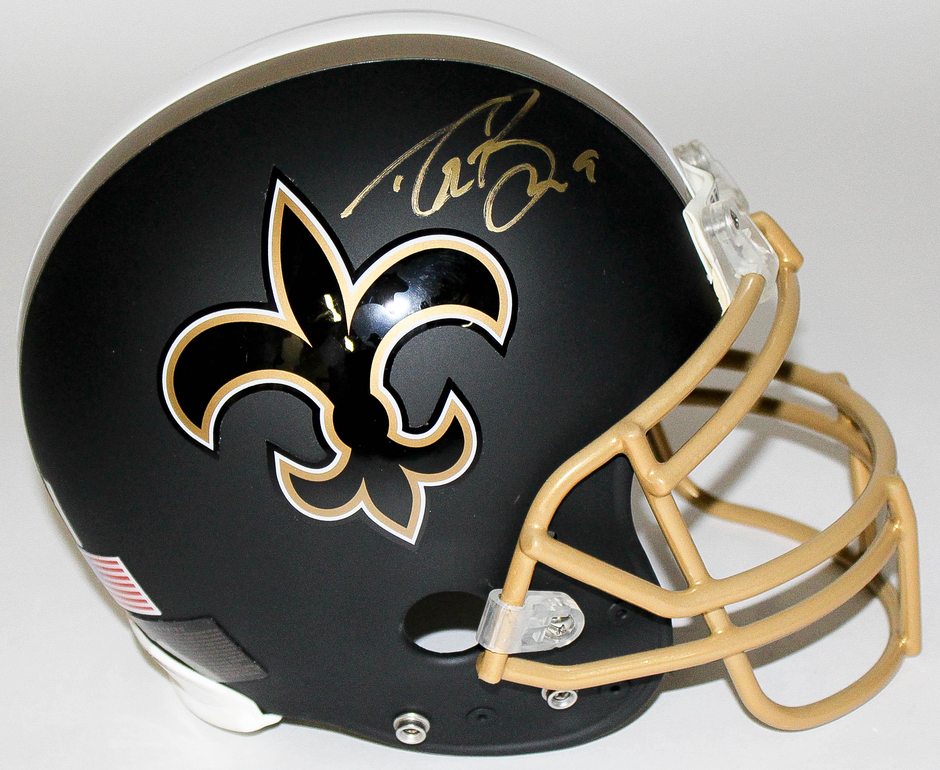 Saints custom matte black full size authentic proline helmet. Hand-signed in gold paint pen by Drew Brees.