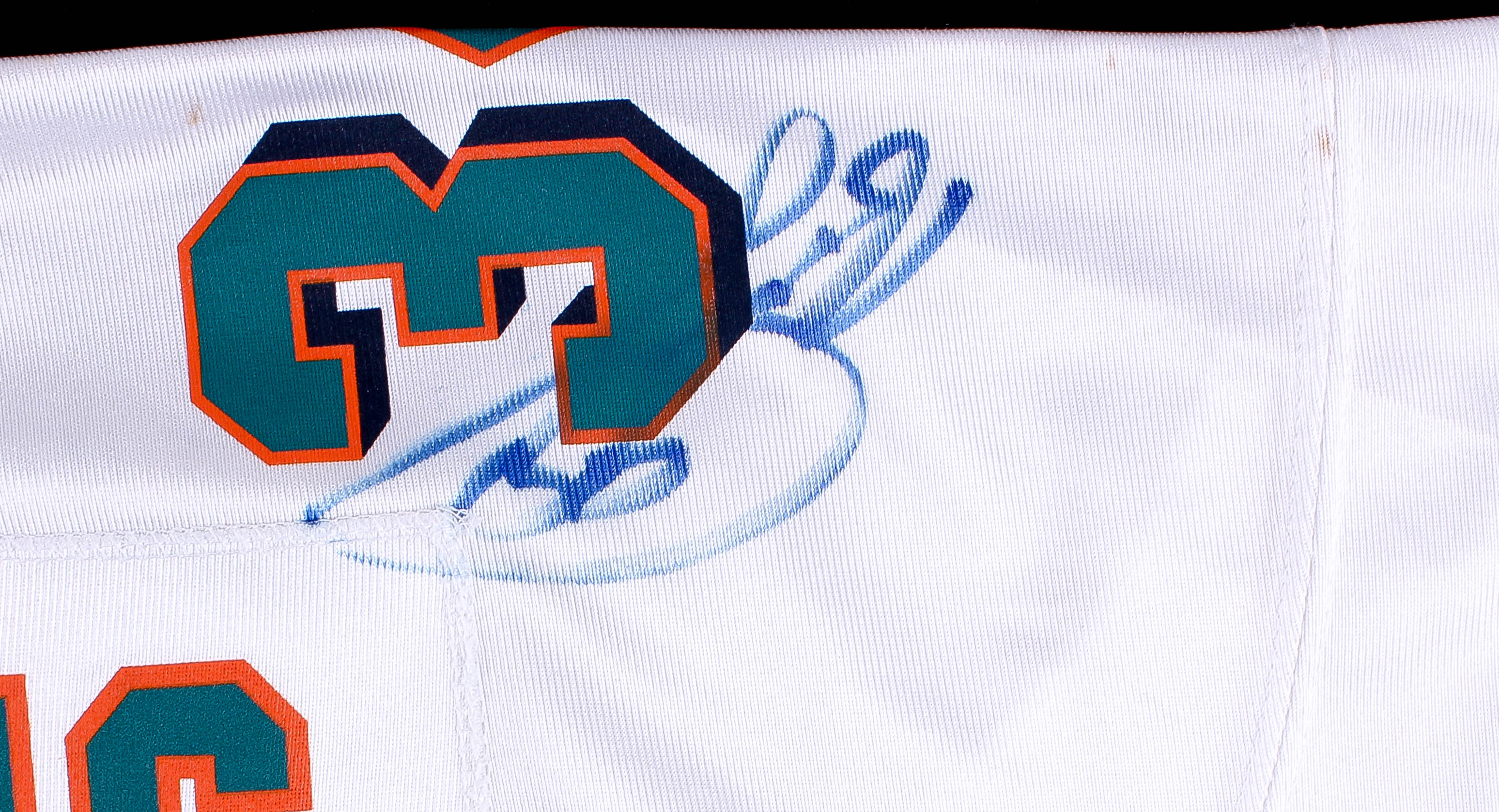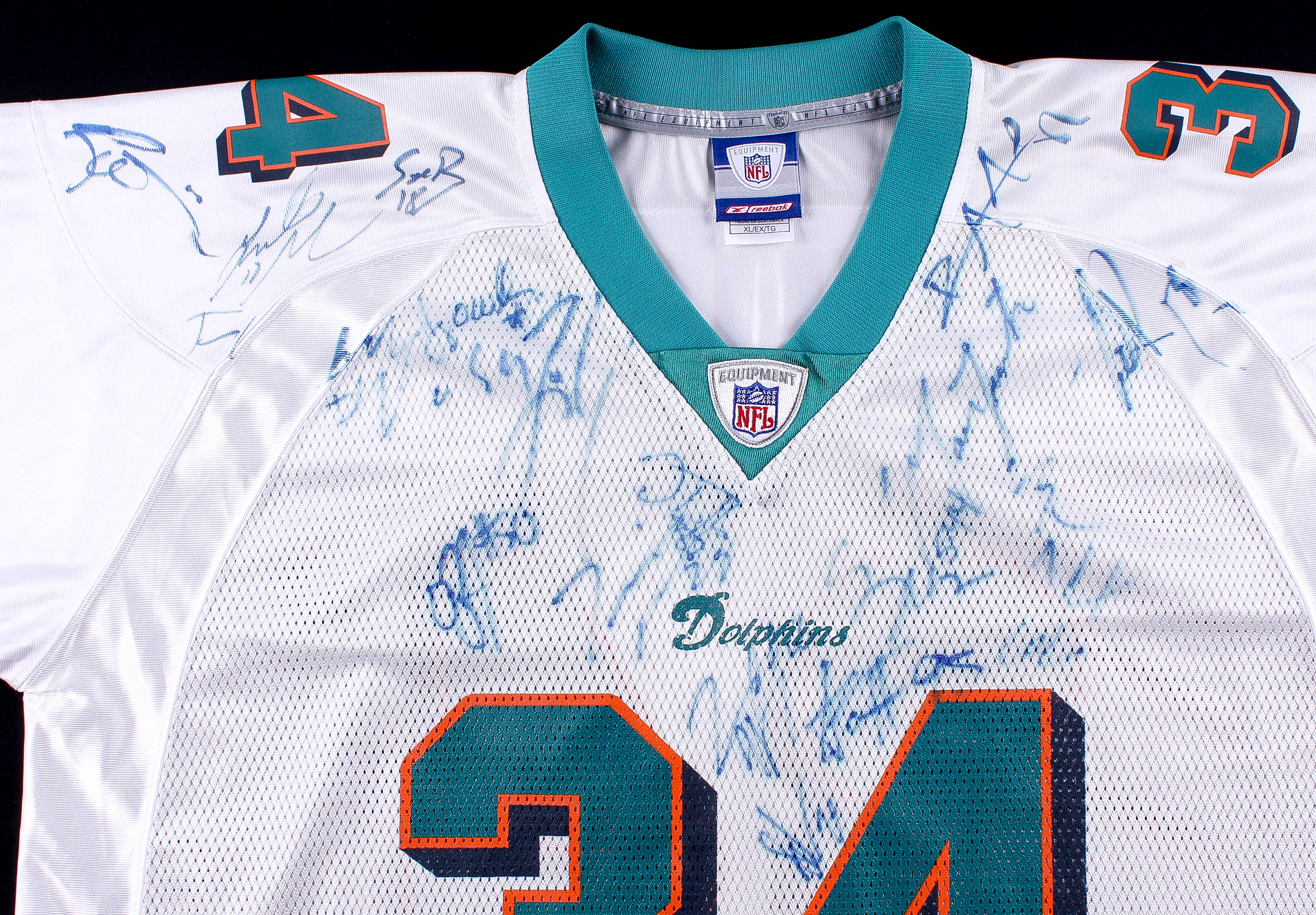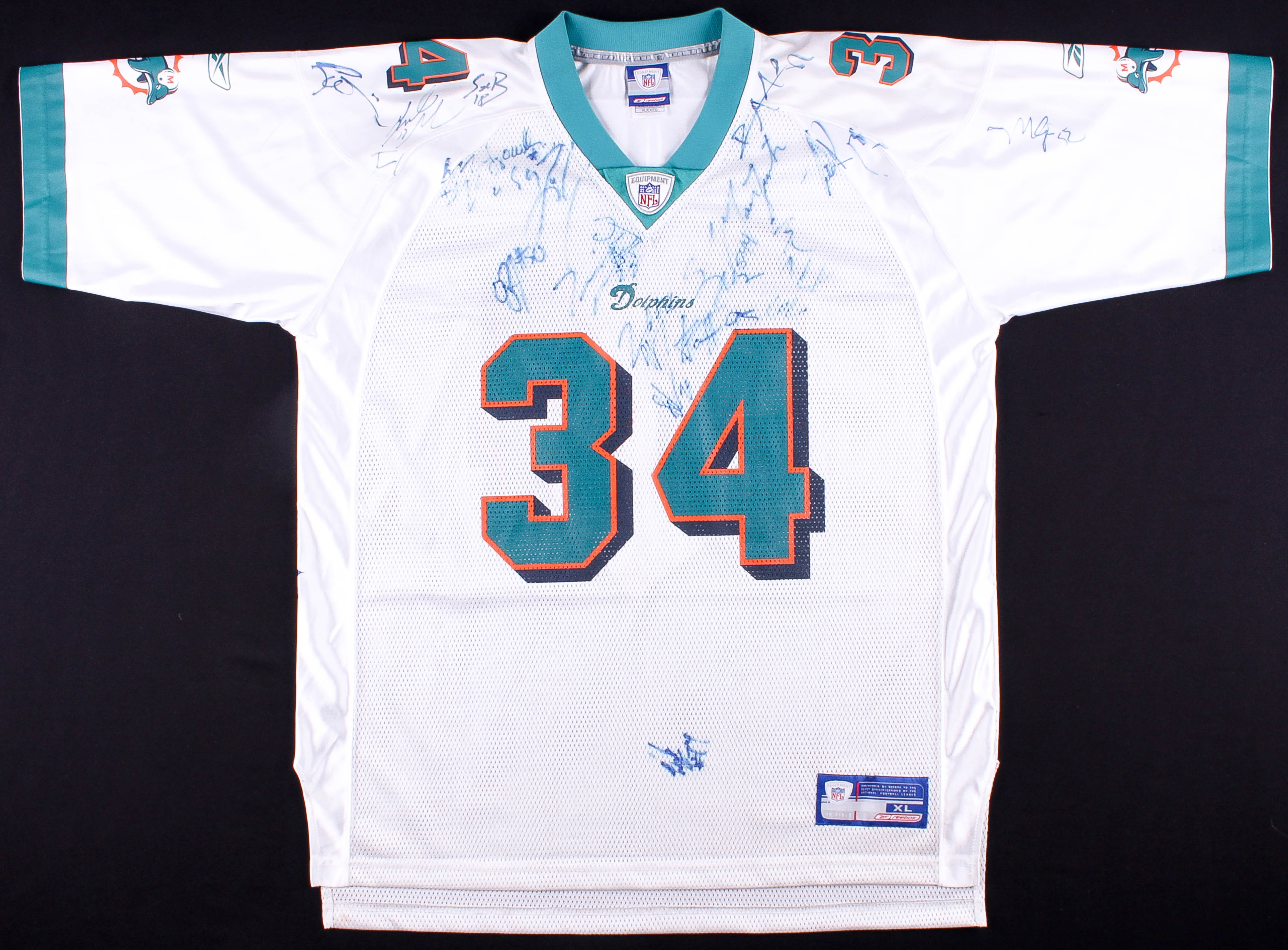 Reebok on-field style jersey, size XL. Hand-signed in blue felt-tip pen pen by Jason Taylor, Ricky Williams, Sage Rosenfels, Zach Thomas, Randy McMichael, Brendon Ayanbedejo, Morion Greenwood, Travis Minor, Leonard Henry, Wade Smith, Matt Turk, Sam Madison, and others. Please note that there are small stains on the jersey.